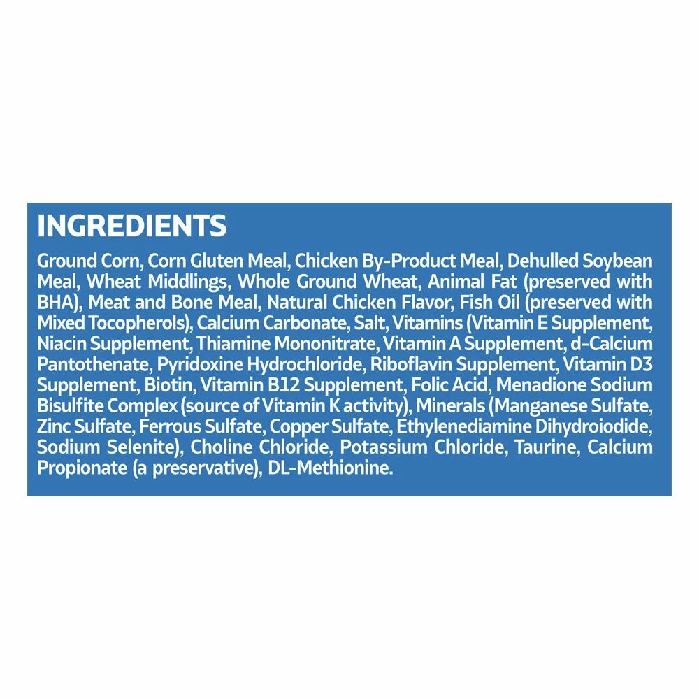 Ground Corn, Corn Gluten Meal, Chicken By-Product Meal, Dehulled Soybean Meal, Wheat Middlings, Whole Ground Wheat, Animal Fat (preserved with BHA), Meat and Bone Meal, Natural Chicken Flavor, Fish Oil (preserved with Mixed Tocopherols), Calcium Carbonate, Salt, Vitamins (Vitamin E Supplement, Niacin Supplement, Thiamine Mononitrate, Vitamin A Supplement, d-Calcium Pantothenate, Pyridoxine Hydrochloride, Riboflavin Supplement, Vitamin D3 Supplement, Biotin, Vitamin B12 Supplement, Folic Acid, Menadione Sodium Bisulfite Complex (source of Vitamin K activity)), Minerals (Manganese Sulfate, Zinc Sulfate, Ferrous Sulfate, Copper Sulfate, Ethylenediamine Dihydroiodide, Sodium Selenite), Choline Chloride, Potassium Chloride, Taurine, Calcium Propionate (a preservative), DL-Methionine.