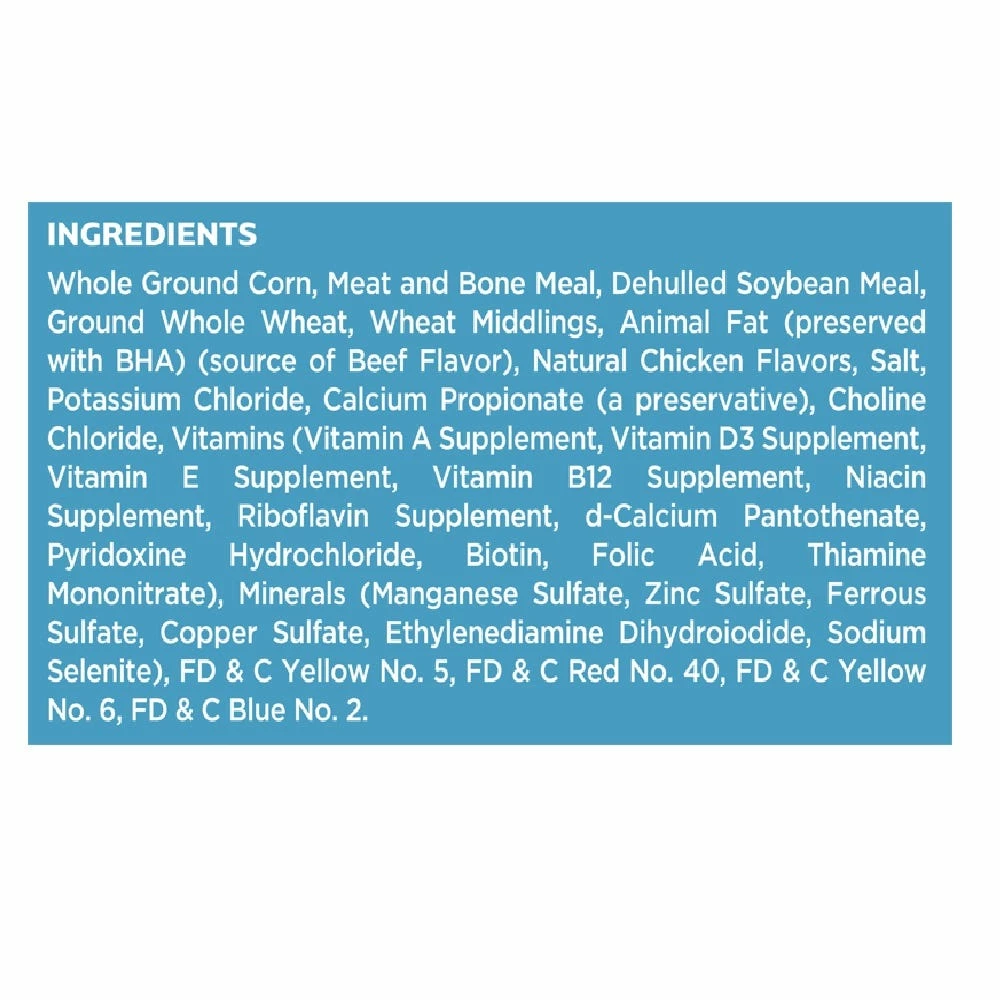 Whole Ground Corn, Meat & Bone Meal, Dehulled Soybean Meal, Ground Whole Wheat, Wheat Middlings, Animal Fat (preserved with BHA) (source of Beef Flavor), Natural Chicken Flavors, Salt, Potassium Chloride, Calcium Propionate (a preservative), Choline Chloride, Vitamins (Vitamin A Supplement, Vitamin D3 Supplement, Vitamin E Supplement, Vitamin B12 Supplement, Niacin Supplement, Riboflavin Supplement, d-Calcium Pantothenate, Pyridoxine Hydrochloride, Biotin, Folic Acid, Thiamine Mononitrate), Minerals (Manganese Sulfate, Zinc Sulfate, Copper Sulfate, Ethylenediamine Dihydriuidudem Sodium Selenite), FD & C Yellow No. 5, FD & C Red No. 40, FD & C Yellow No. 6, FD & C Blue No. 2.