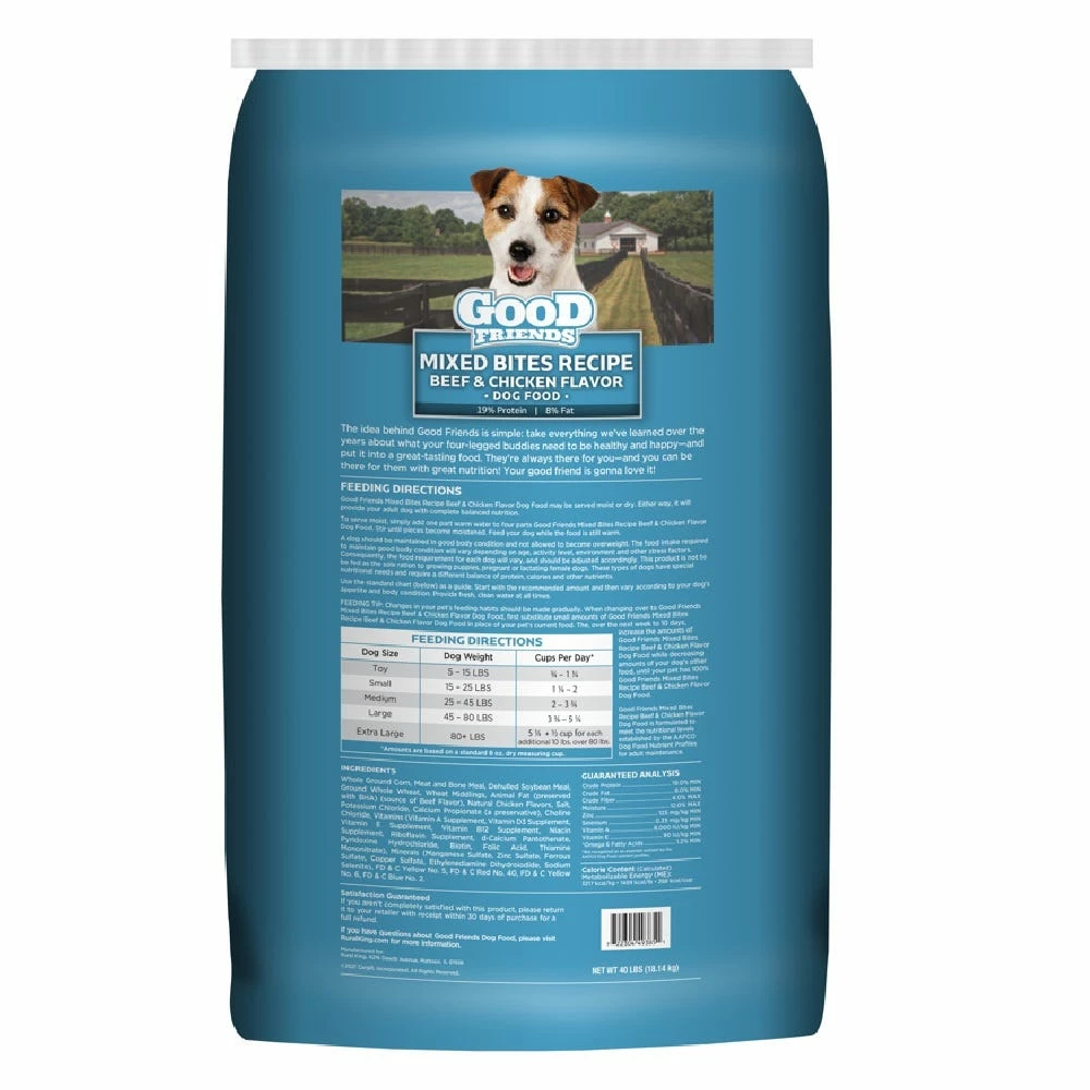 Good Friends Mixed Bites Recipe Beef & Chicken Dog Food may be moist or dry. Either way, it will provide your adult dog with complete balanced nutrition.