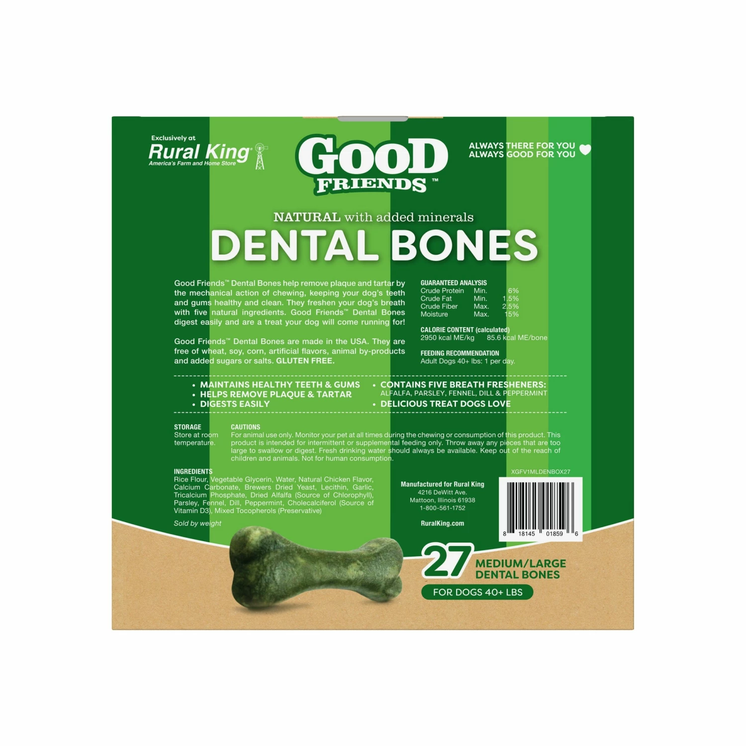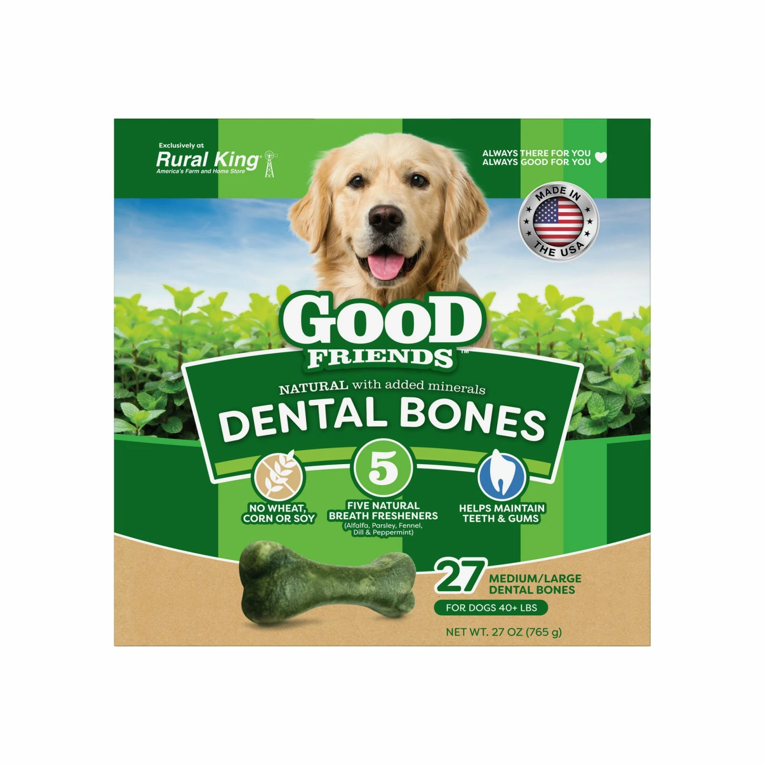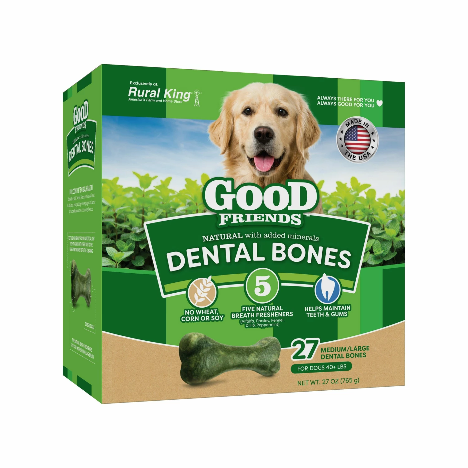 Good Friends Dental Bones help remove plaque and tarter by the mechanical action of shewing, keeping your dog’s teeth and gums healthy and clean. They freshen your dog’s breath with five natural ingredients. Good Friends Dental Bones digest easily and are a treat your dog will come running for! Good Friends Dental Bones are made in the USA. They are free of wheat, soy, corn artificial flavors, animal-by-products and added sugar or salts. Gluten Free.