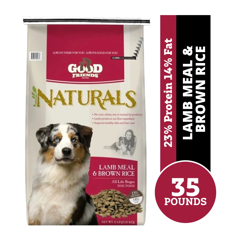 Adult Dogs: Good Friends™ Naturals Lamb Meal with Brown Rice Formula Dog Food can be fed in dry form or moistened with warm water. If your dog prefers the moistened form, mix 6 parts Good Friends™ Naturals Lamb Meal with Brown Rice Formula Dog Food with 1 part warm water, allow the mixture to stand for approximately 5 minutes, then stir and serve.