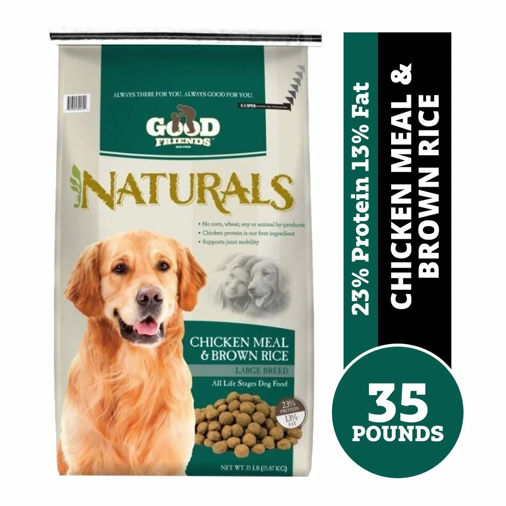 Adult Dogs: Good Friends™ Naturals Chicken Meal with Brown Rice Formula Large Breed Dog Food can be fed in dry form or moistened with warm water. If your dog prefers the moistened form, mix 6 parts Good Friends™ Naturals Chicken Meal with Brown Rice Formula Large Breed Dog Food with 1 part warm water, allow the mixture to stand for approximately 5 minutes, then stir and serve.