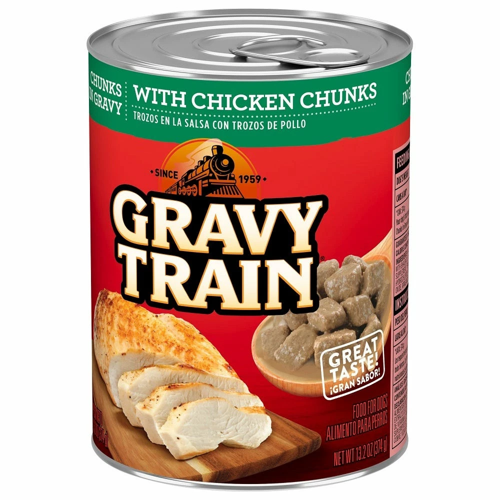 Gravy Train Chunks in Gravy With Chicken Chunks wet dog food recipe features tasty chicken flavored chunks in a savory gravy that any adult dog will enjoy. This canned dog food is full of more than irresistible flavor—it also provides 100% complete and balanced nutrition for adult dogs. Buy now—with tastes this great, your dog is sure to be on board!