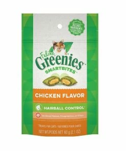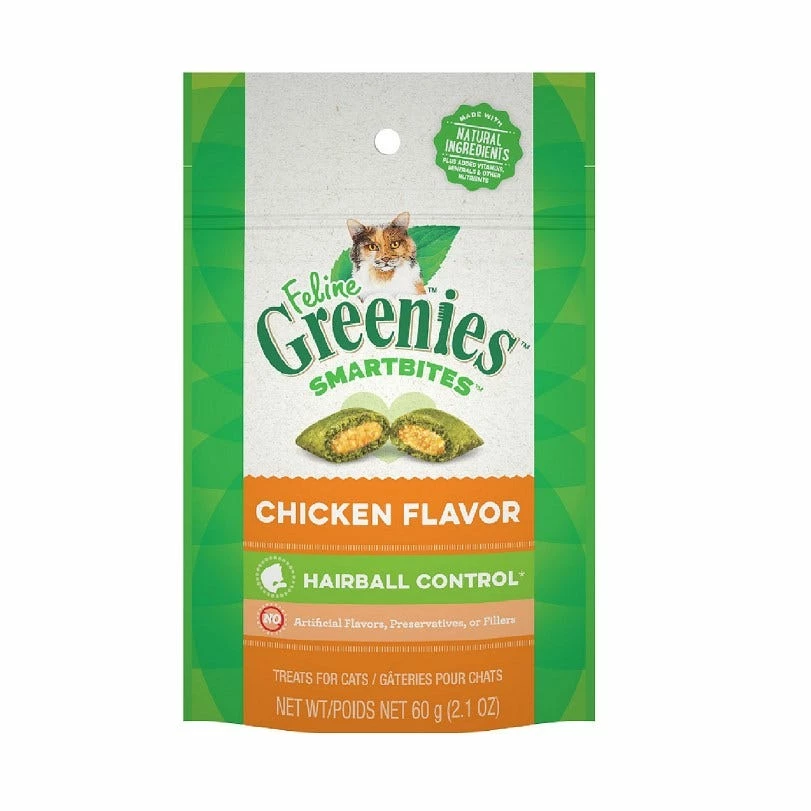 Reward your favorite feline with a delicious and nutritious treat you can trust with Greenies Feline SmartBites Hairball Control Chicken Flavor Cat Treats. These soft yet crunchy rewards are designed by veterinarians and contain Greenies fiber blend formula to help minimize hairball formation and promote healthy digestion when fed along with a hairball control diet. Now made without artificial flavors, preservatives or fillers, these dual-textured treats also contain just under 2 calories, plus vitamins, minerals along with other nutrients to support overall health. And your paw-tner will love how every bite is bursting with a purr-worthy chicken flavor!