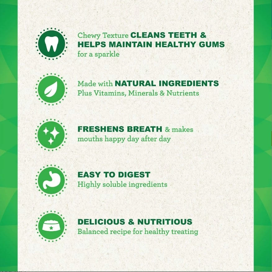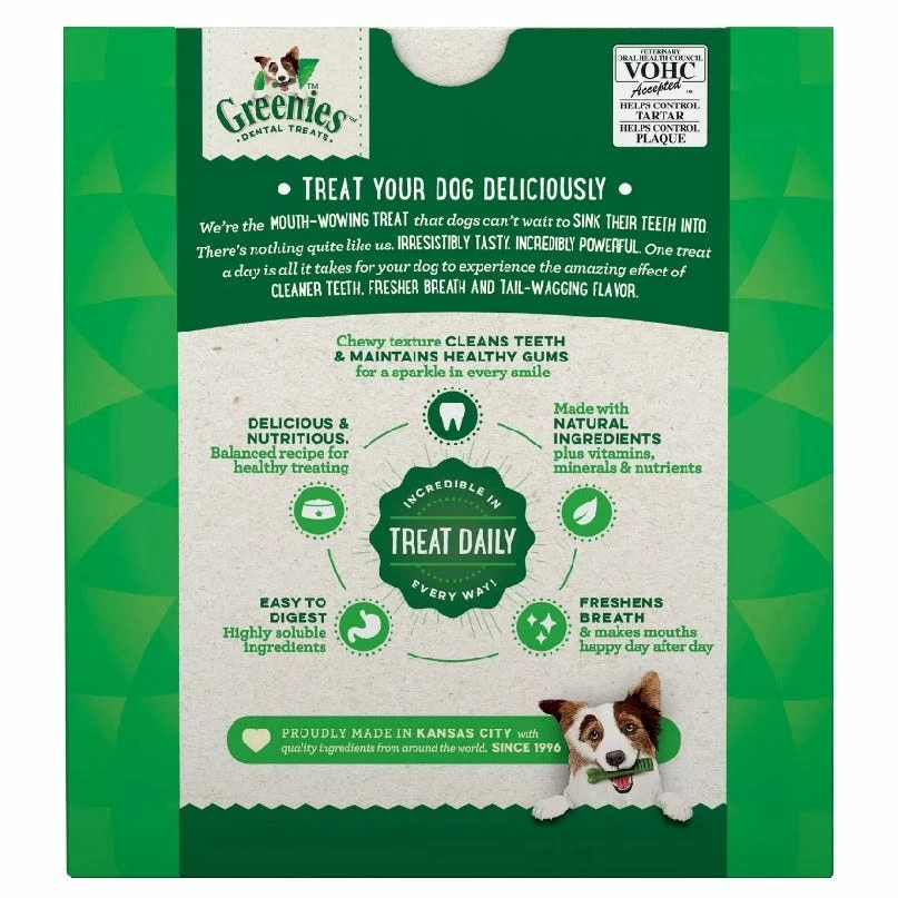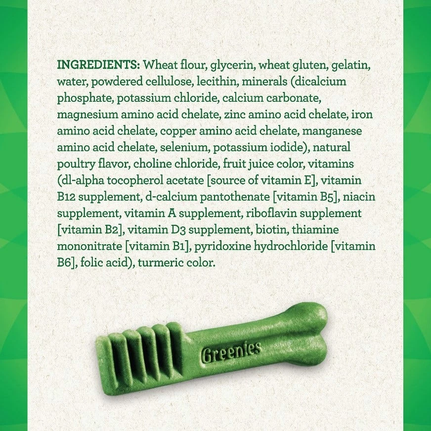 Ingredients: Wheat Flour, Glycerin, Wheat Gluten, Gelatin, Water, Powdered Cellulose, Lecithin, Minerals (Dicalcium Phosphate, Potassium Chloride, Calcium Carbonate, Magnesium Amino Acid Chelate, Zinc Amino Acid Chelate, Iron Amino Acid Chelate, Copper Amino Acid Chelate, Manganese Amino Acid Chelate, Selenium, Potassium Iodide), Natural Poultry Flavor, Choline Chloride, Fruit Juice Color, Vitamins ( Dl-Alpha Tocopherol Acetate [Source Of Vitamin E], Vitamin B12 Supplement, D-Calcium Pantothenate [Vitamin B5], Niacin Supplement, Vitamin A Supplement, Riboflavin Supplement [Vitamin B2], Vitamin D3 Supplement, Biotin, Thiamine Mononitrate [Vitamin B1], Pyridoxine Hydrochloride [Vitamin B6], Folic Acid), Turmeric Color. Feed 1 GREENIESâ„¢ Dental Treat per day. For dogs 50 – 100 lbs. Not suitable for dogs less than 5 lbs., or dogs less than 6 months of age. Fresh drinking water should always be available. ATTENTION: As with any edible product, monitor your dog to ensure the treat is adequately chewed. Gulping any item can be harmful or even fatal to a dog. For each GREENIESâ„¢ dental treat fed, reduce your dog’s main meal by 145 kcal. Choose the Right Size for Your Dog:
