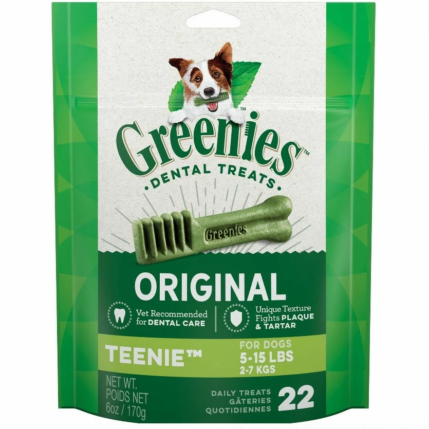 Support your furry sidekick’s dental health with Greenies Teenie Dental Dog Treats! These delicious original flavor dental dog treats are crafted with an irresistibly chewy texture that helps remove plaque and tartar. These natural dog treats are vet recommended for at-home oral health care because they help promote oral hygiene, freshen breath and contain highly soluble ingredients that are safe and easy for your pup to digest. Plus, you can feel extra confident knowing that these whisker-licking treats promote your canine companion’s overall health with vitamins, minerals and other nutrients! These treats are paw-fect for toy breeds and dogs between 5 and 15 lbs.