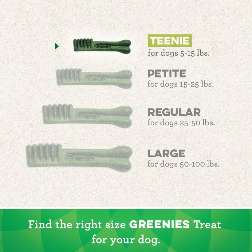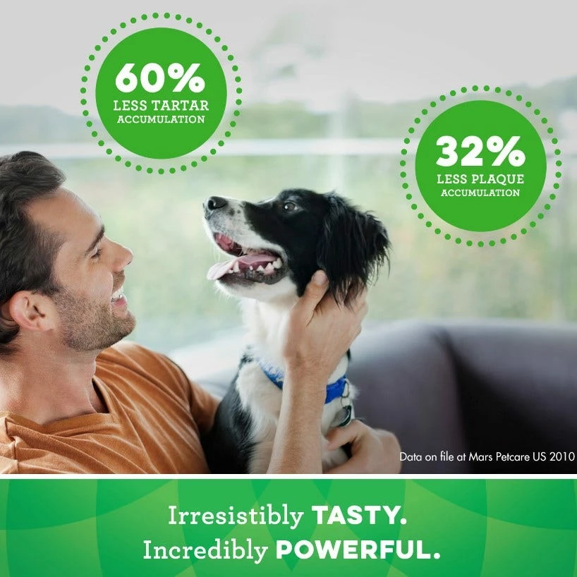 Ingredients: Wheat Flour, Wheat Gluten, Glycerin, Gelatin, Oat Fiber, Water, Lecithin, Natural Poultry Flavor, Minerals (Dicalcium Phosphate, Potassium Chloride, Calcium Carbonate, Magnesium Amino Acid Chelate, Zinc Amino Acid Chelate, Iron Amino Acid Chelate, Copper Amino Acid Chelate, Manganese Amino Acid Chelate, Selenium, Potassium Iodide), Dried Apple Pomace, Choline Chloride, Fruit Juice Color, Vitamins ( Dl-Alpha Tocopherol Acetate [Source Of Vitamin E], Vitamin B12 Supplement, D-Calcium Pantothenate [Vitamin B5], Niacin Supplement, Vitamin A Supplement, Riboflavin Supplement [Vitamin B2], Vitamin D3 Supplement, Biotin, Pyridoxine Hydrochloride [Vitamin B6], Thiamine Mononitrate [Vitamin B1], Folic Acid), Turmeric Color Feed 1 Greenies™ Dental Treat per day. For dogs 5 – 15 lbs. Not suitable for dogs less than 5 lbs, or dogs less than 6 months of age. Fresh drinking water should always be available. Attention: As with any edible product, monitor your dog to ensure the treat is adequately chewed. Gulping any item can be harmful or even fatal to a dog. For each Greenies™ dental treat fed, reduce your dog’s main meal by 26 kcal.