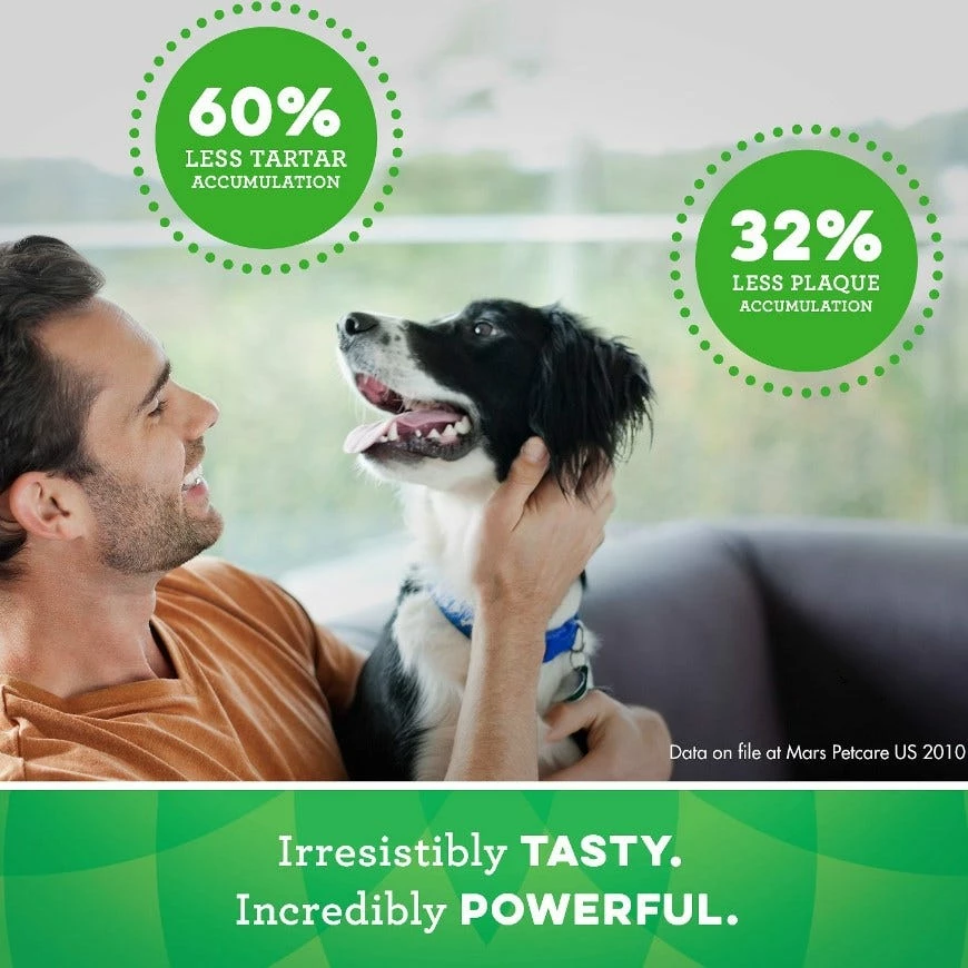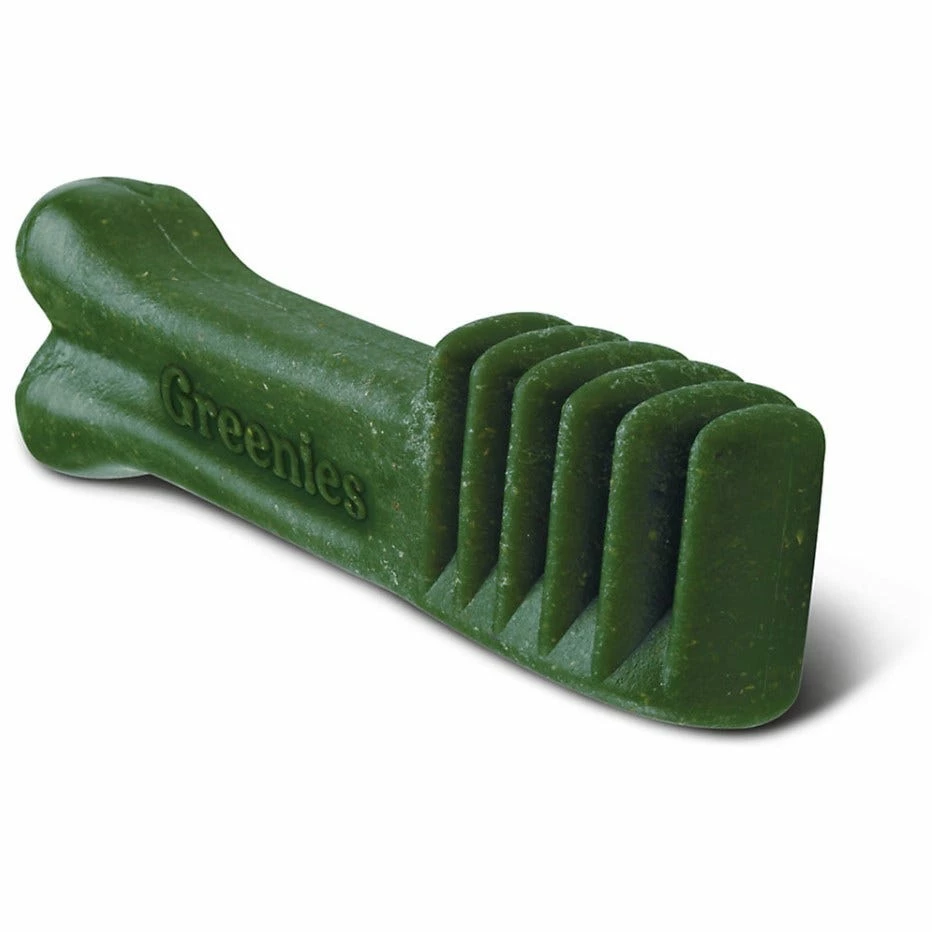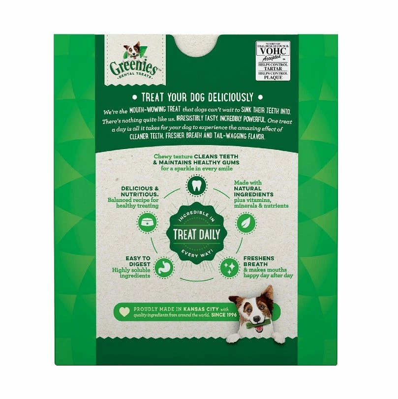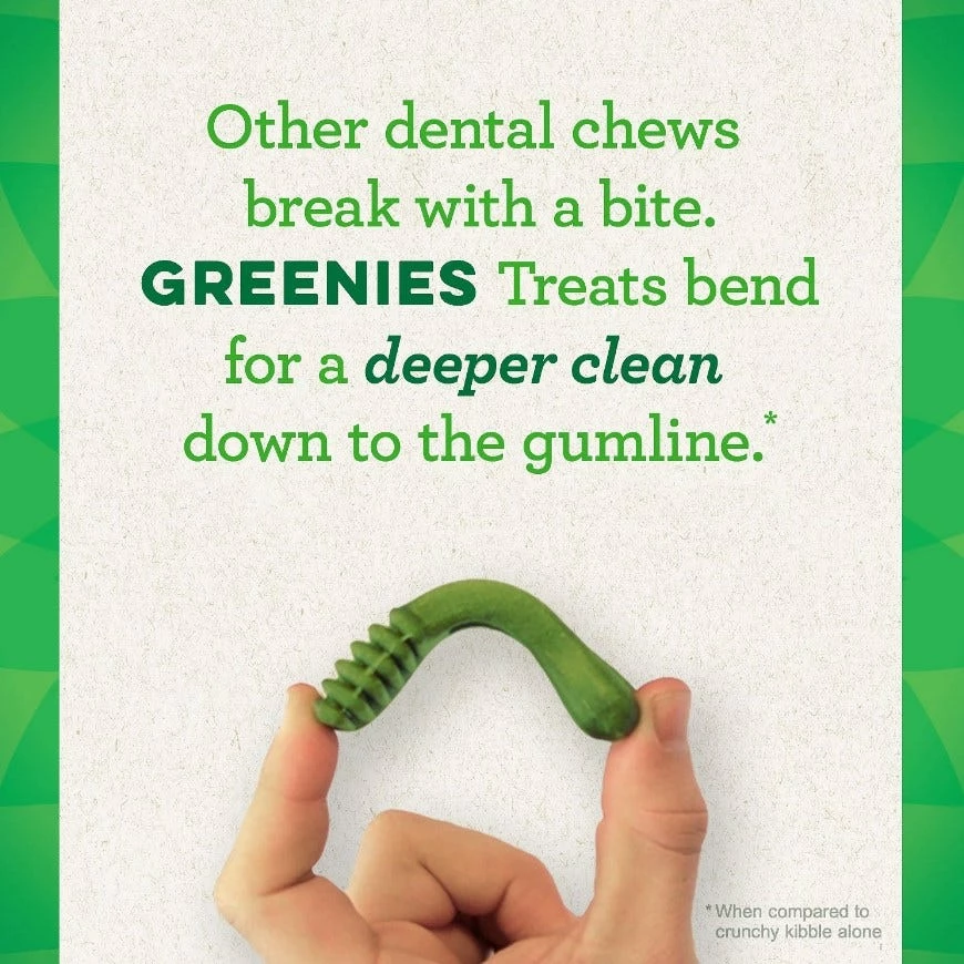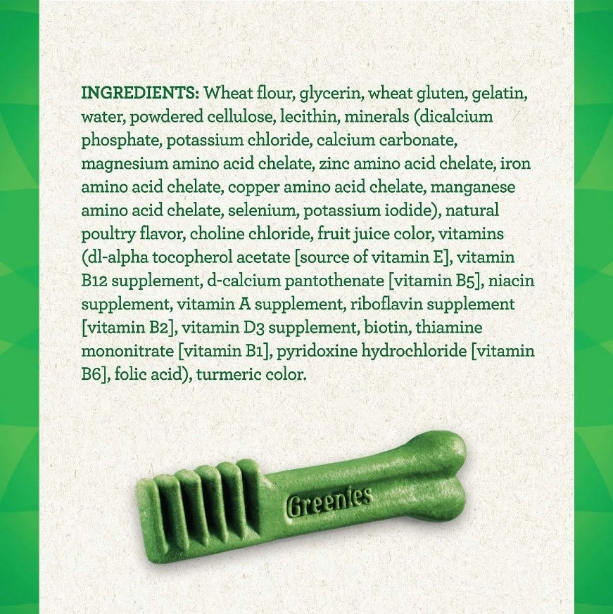 Ingredients: Wheat Flour, Wheat Gluten, Glycerin, Gelatin, Oat Fiber, Water, Lecithin, Natural Poultry Flavor, Minerals (Dicalcium Phosphate, Potassium Chloride, Calcium Carbonate, Magnesium Amino Acid Chelate, Zinc Amino Acid Chelate, Iron Amino Acid Chelate, Copper Amino Acid Chelate, Manganese Amino Acid Chelate, Selenium, Potassium Iodide), Dried Apple Pomace, Choline Chloride, Fruit Juice Color, Vitamins ( Dl-Alpha Tocopherol Acetate [Source Of Vitamin E], Vitamin B12 Supplement, D-Calcium Pantothenate [Vitamin B5], Niacin Supplement, Vitamin A Supplement, Riboflavin Supplement [Vitamin B2], Vitamin D3 Supplement, Biotin, Pyridoxine Hydrochloride [Vitamin B6], Thiamine Mononitrate [Vitamin B1], Folic Acid), Turmeric Color Feed 1 GREENIES™ Dental Treat per day. For dogs 5 – 15 lbs. Not suitable for dogs less than 5 lbs, or dogs less than 6 months of age. Fresh drinking water should always be available. ATTENTION: As with any edible product, monitor your dog to ensure the treat is adequately chewed. Gulping any item can be harmful or even fatal to a dog. For each GREENIES™ dental treat fed, reduce your dog’s main meal by 26 kcal. Choose the Right Size for Your Dog