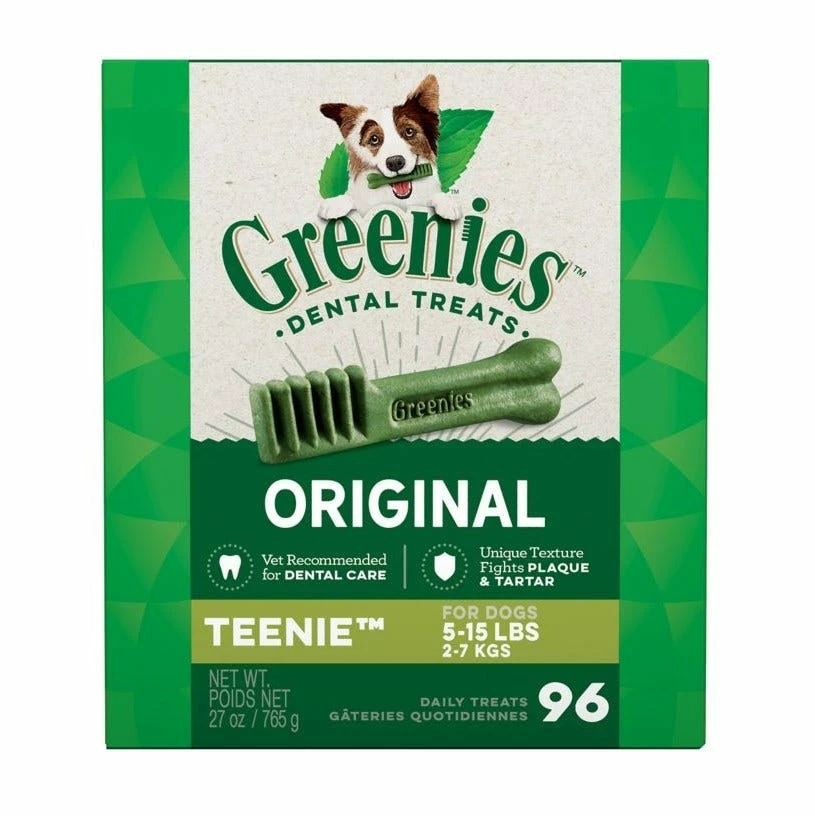 Support your furry sidekick’s dental health with Greenies Teenie Dental Dog Treats! These delicious original flavor dental dog treats are crafted with an irresistibly chewy texture that helps remove plaque and tartar. These natural dog treats are vet recommended for at-home oral health care because they help promote oral hygiene, freshen breath and contain highly soluble ingredients that are safe and easy for your pup to digest. Plus, you can feel extra confident knowing that these whisker-licking treats promote your canine companion’s overall health with vitamins, minerals and other nutrients! These treats are paw-fect for toy breeds and dogs between 5 and 15 lbs.