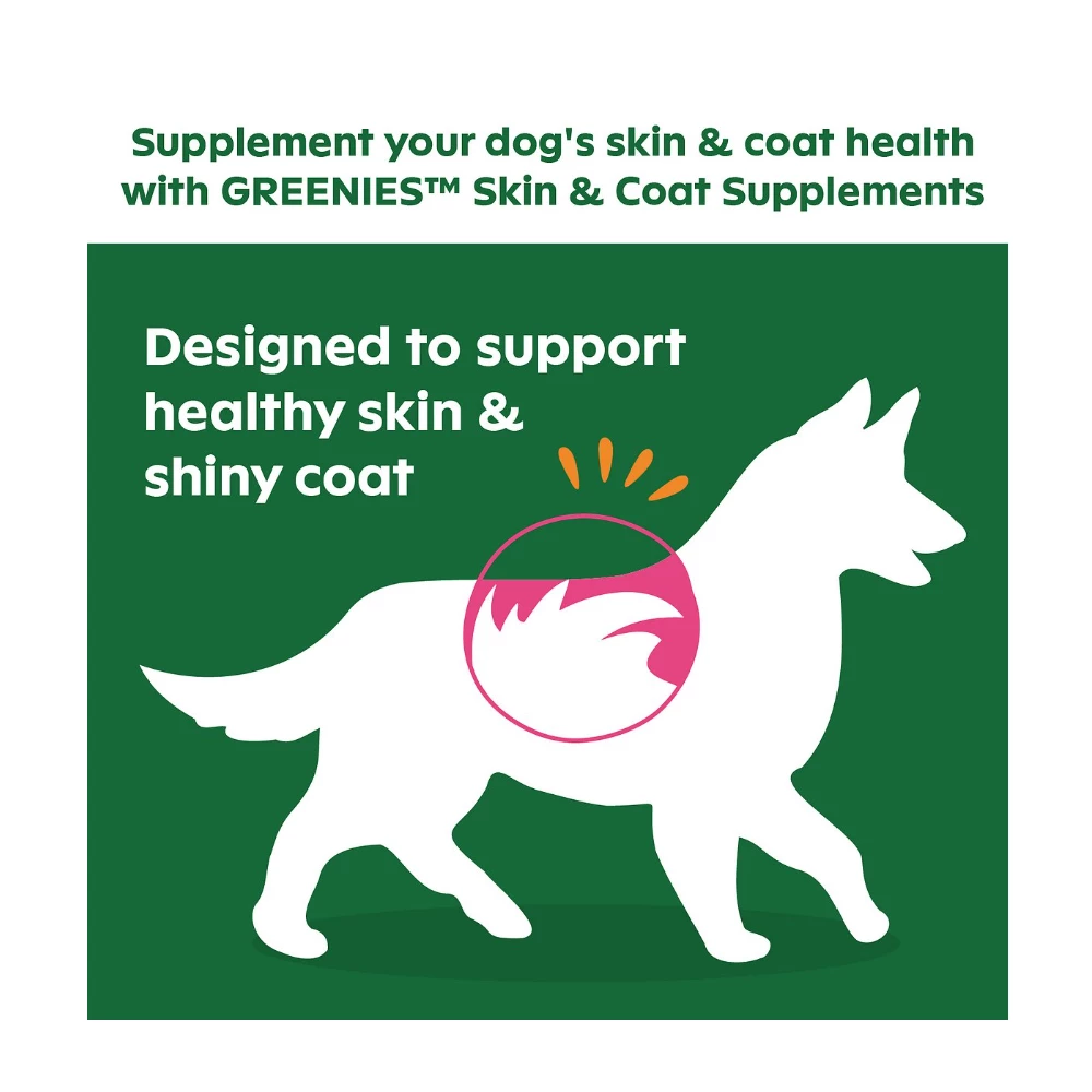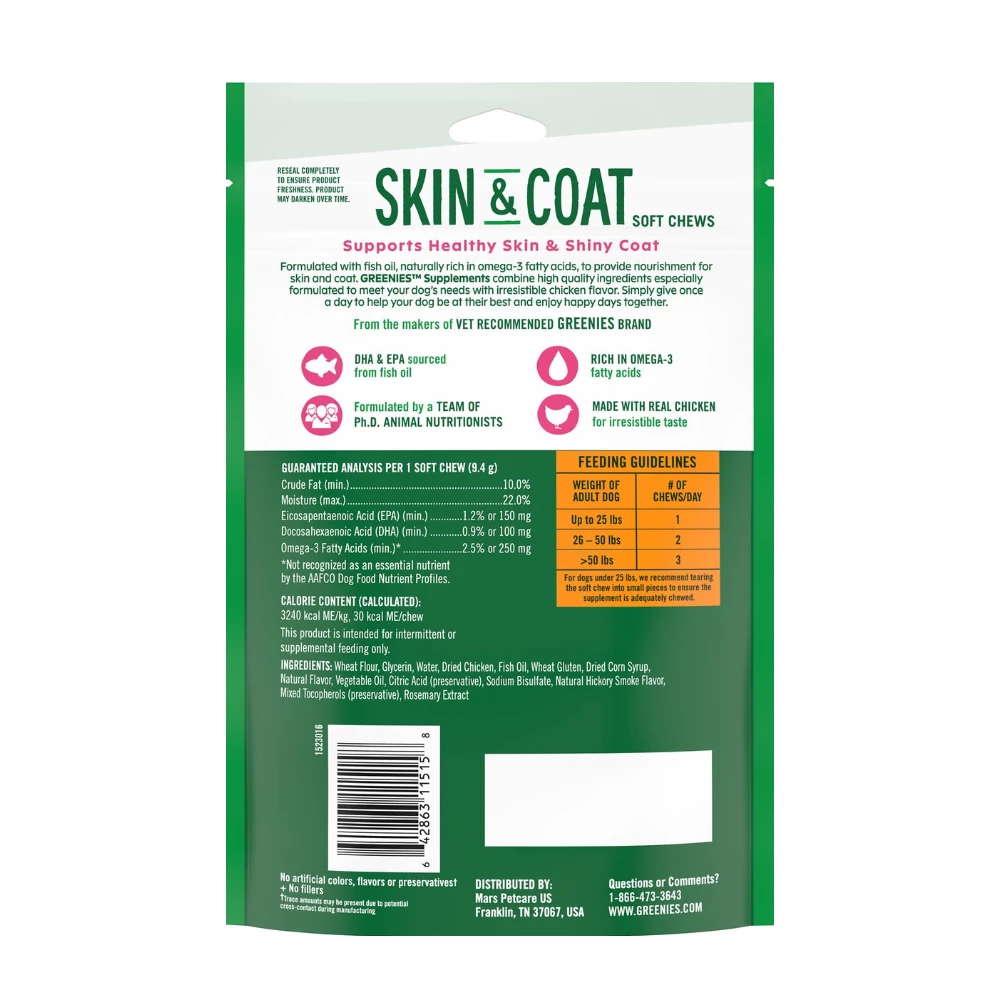 Help keep your furry friend looking and feeling his best with Greenies Chicken Flavored Soft Chew Skin & Coat Supplement for Dogs. Formulated by a team of animal nutritionists to support healthy skin and a shiny coat, these tasty supplement chews are made with fish oil, which is naturally rich in omega-3 fatty acids like EPA and DHA. Ideal for adult dogs of all sizes, they are an easy way to provide extra nourishment for your dog’s skin and coat. Real chicken in the recipe makes them taste irresistible, and they are made with no artificial colors, flavors, preservatives or fillers. Simply give your dog one a day to help keep him looking and feeling his best—you’ll notice the difference, and so will he!