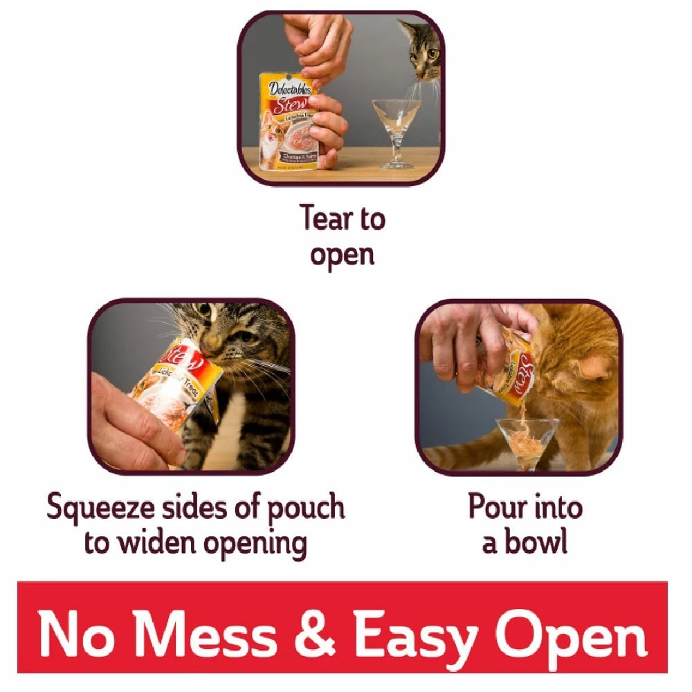 Feed up to 2 pouches per day for an averaged size adult cat. Delectables Bisque Lickable Treats are intended for intermittent and supplemental feeding only. This product may be fed daily along with a complete and balanced cat food diet.
