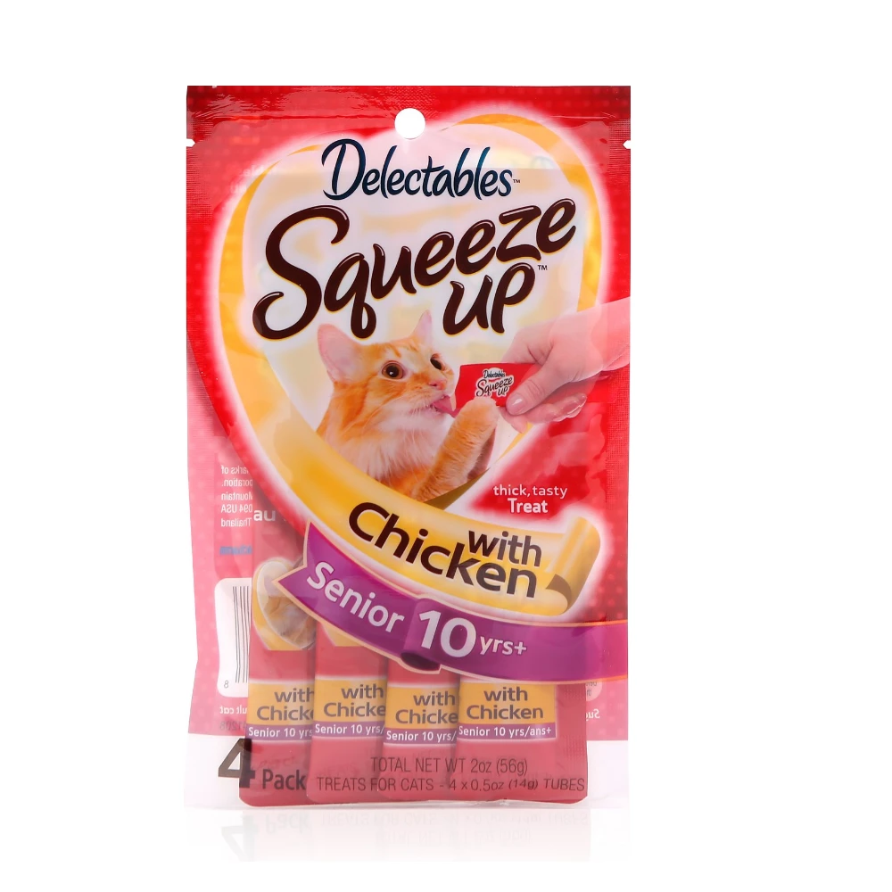 Squeeze up some fun with Hartz Delectables Senior Squeeze Up Chicken Lickable Cat Treats. Each .5 ounce lickable tube is stuffed with a rich and thick creamy puree in lip smacking flavors cats find paw-sitively delicious! Squeeze Ups provide the perfect bonding experience between you and your senior cat companion and are a new, exciting way to reward your furry friend. This tasty Squeeze Up puree is made with real chicken and tuna and has vitamin E and B vitamins to support your senior cat’s health. This tasty puree can be hand fed, squeezed into a bowl or used as a savory food topper to entice finicky eaters. Give your cat a new snacking experience that’s fun for the both of you with Hartz Delectables Squeeze Ups. Meow we’re talking!