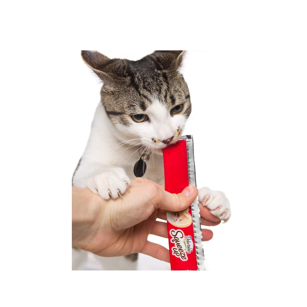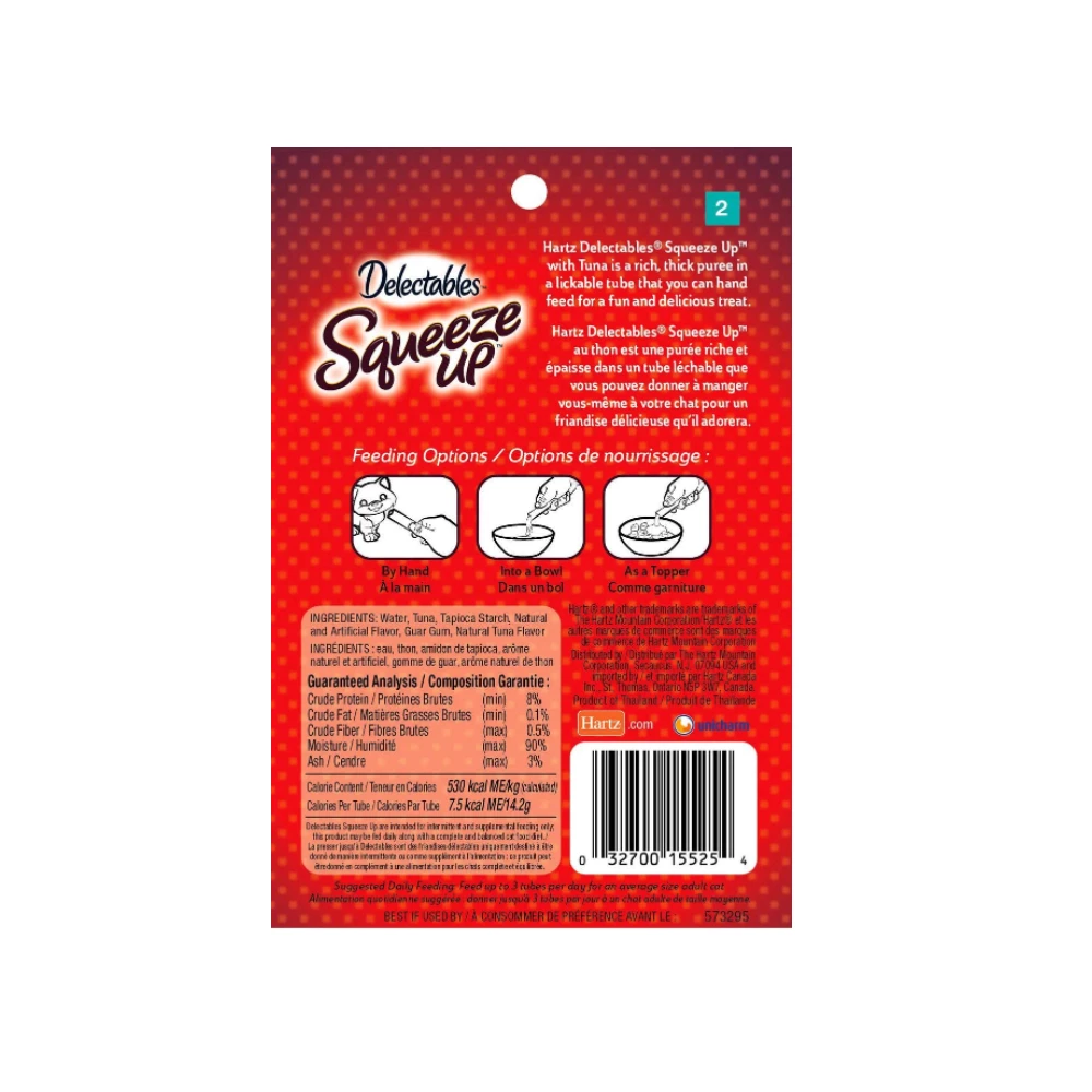 Give your cat a new way to snack with the Hartz Delectables Squeeze Ups Tuna Lickable Cat Treat. Because he’s extra special, you need an extra special way to give him a reward. Coming in lickable tube with the mouthwatering flavor of tuna, you can hand feed your kitty for a fun and bonding experience. Or, squeeze the goodness into his bowl and watch him lick away! It’s also a great topper for dry food, with a rich and thick puree that mixes right in and entices him to gobble up every last bite. Any way you serve it, this lickable treat will leave him licking his chops!