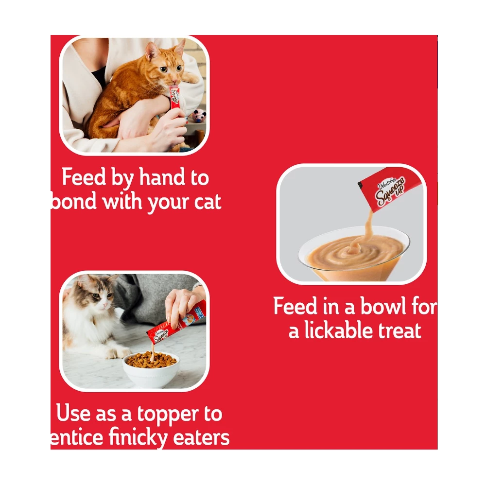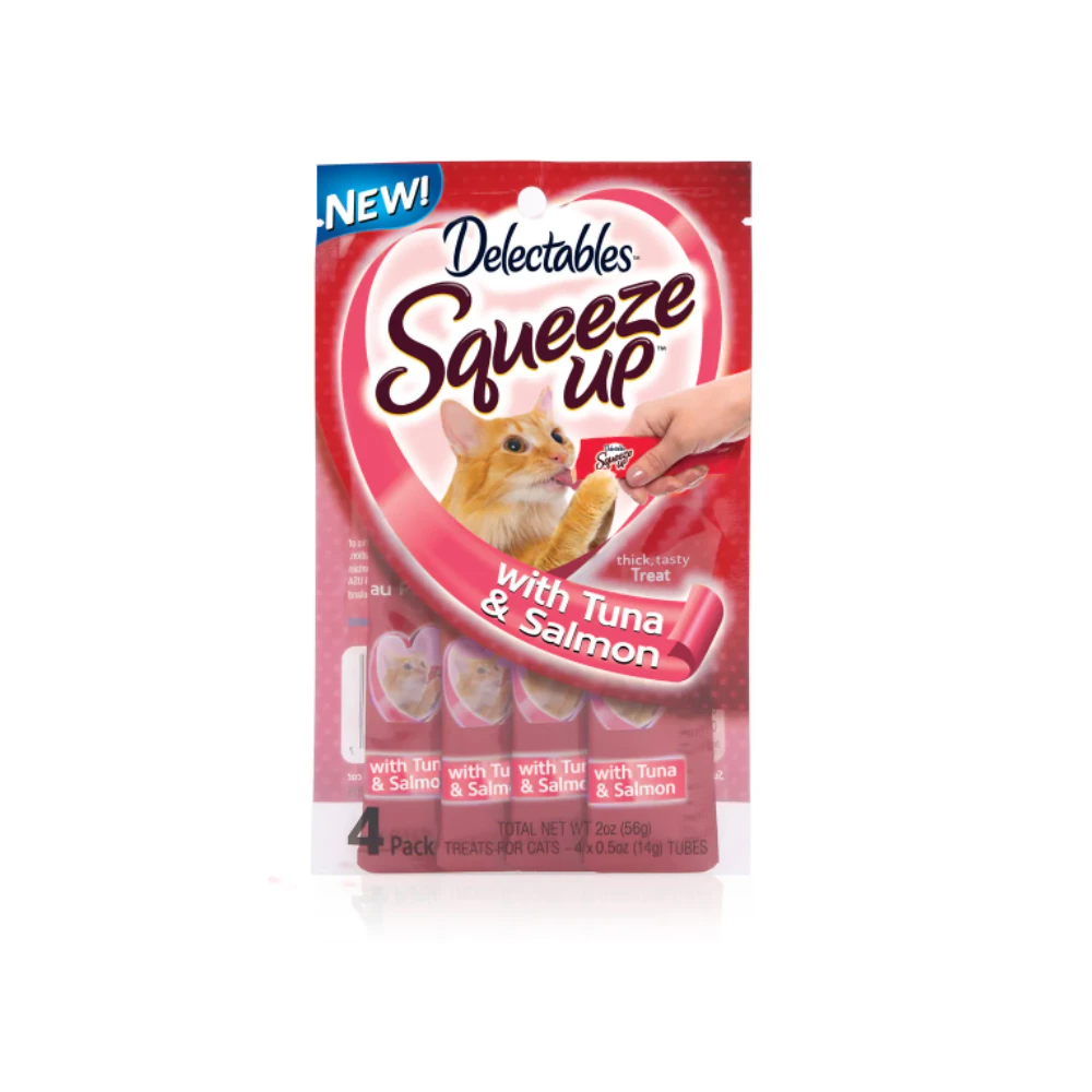 Give your cat a new way to snack with the Hartz Delectables Squeeze Up Tuna & Salmon Lickable Cat Treats. Because he’s extra special, you need an extra special way to give him a reward. Coming in lickable tube with the mouthwatering flavor of tuna and salmon, you can hand feed your kitty for a fun and bonding experience. Or, squeeze the goodness into his bowl and watch him lick away! It’s also a great topper for dry food, with a rich and thick puree that mixes right in and entices him to gobble up every last bite. Any way you serve it, this lickable treat will leave him licking his chops!