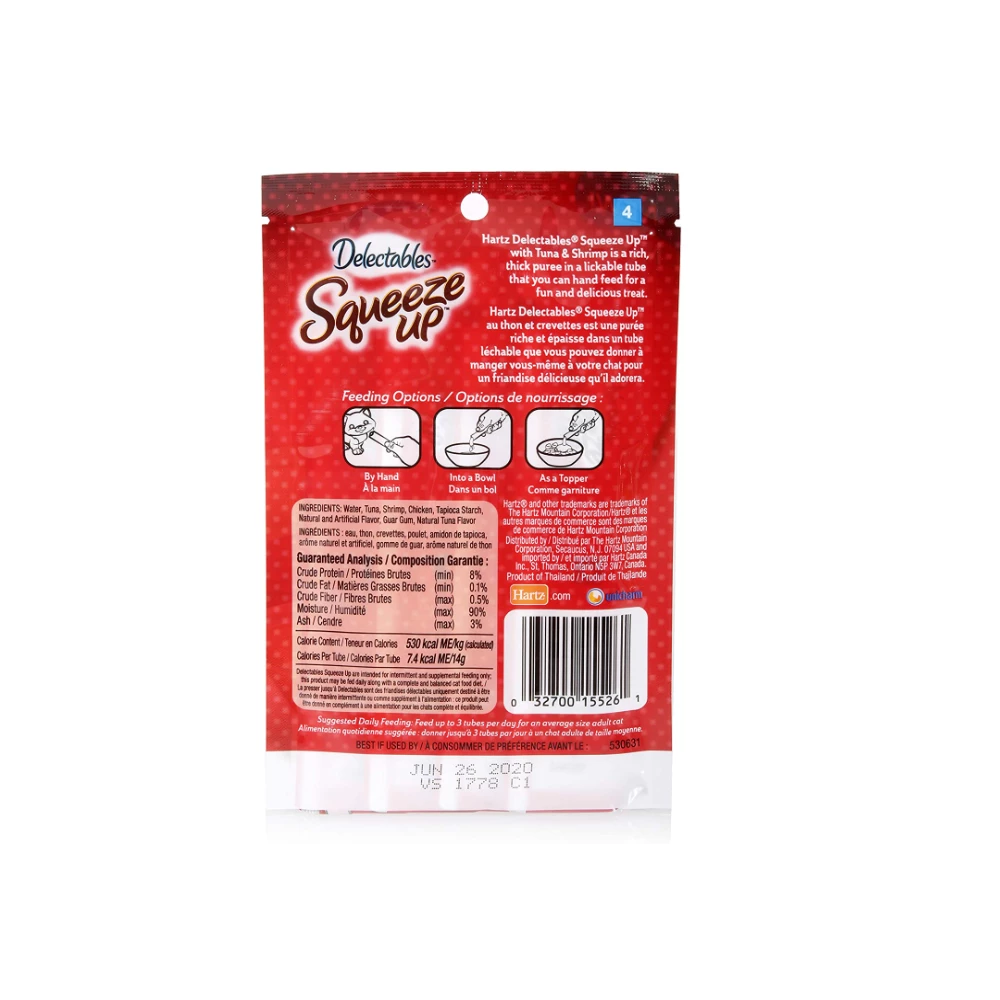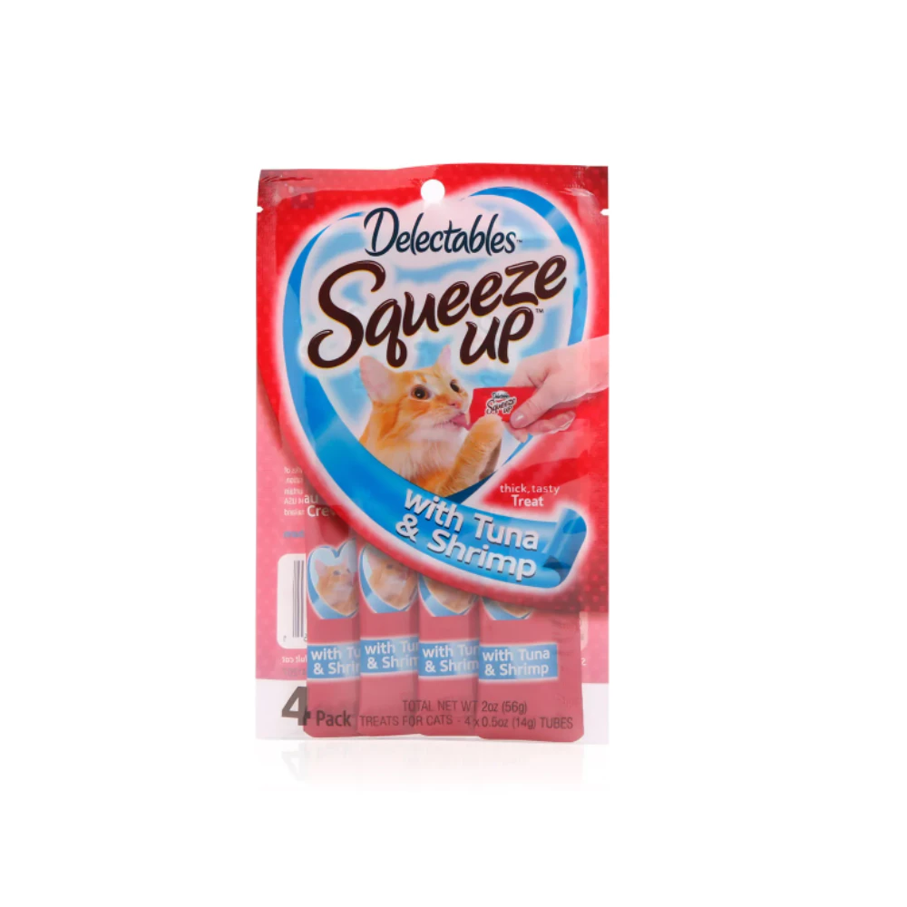 Squeeze up some fun with Delectables interactive wet cat treats. Each .5 ounce lickable tube is stuffed with a rich and thick creamy puree in lip smacking flavors cats find paw-sitively delicious! Squeeze Ups provide the perfect bonding experience between you and your cat companion and are a new, exciting way to reward your furry friend. This tasty Squeeze Up puree is made with real tuna, shrimp and chicken and can be hand fed, squeezed into a bowl, or used as a savory food topper to entice finicky eaters. Give your cat a new snacking experience that’s fun for the both of you with Hartz Delectables Squeeze Ups. Meow we’re talking!