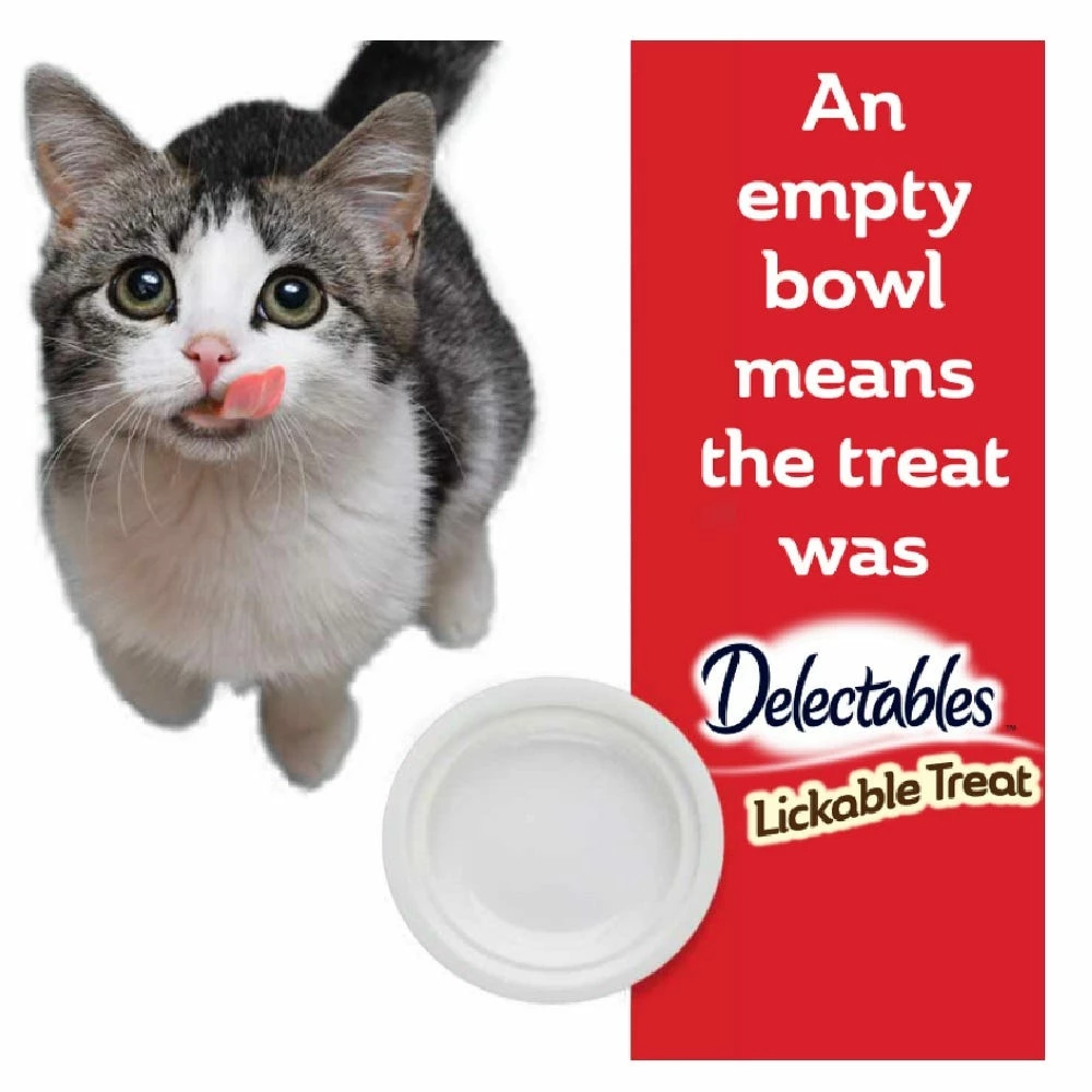 Feed up to 2 pouches per day for an averaged size adult cat. Delectables Bisque Lickable Treats are intended for intermittent and supplemental feeding only. This product may be fed daily along with a complete and balanced cat food diet.