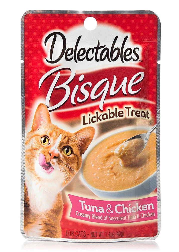 Hartz Delectables Bisque Tuna & Chicken Lickable Cat Treat is a deliciously unique, single serve, wet treat cats purr for. Your cat will enjoy this yummy combination of tender, real tuna and chicken with delicious juices blended into a creamy purée. Make every treat time something truly special with this lickable, tasty treat your cat will crave.