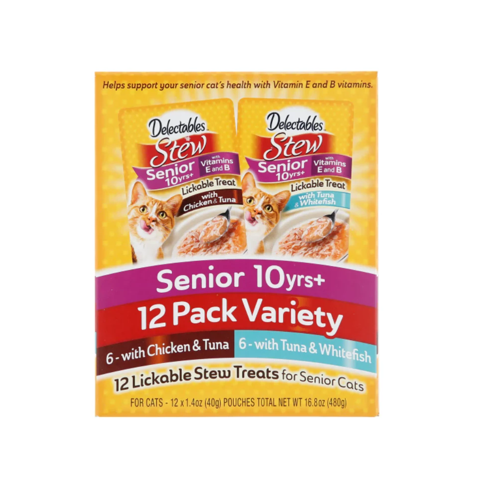 Treat your kitty to the best of both land and sea with Hartz Delectables Senior 10+ Stew & Bisque Variety Pack Lickable Cat Treats. Each case comes with six packets of Tuna & Chicken Bisque recipes and six Chicken & Tuna Stew recipes. The Bisque offers a smooth texture, while the Stew delivers a hearty consistency that’s sure to please the finickiest felines. These delicious and nutritious gourmet lickable cat treats are crafted with either real fish or chicken for the high-quality protein your BFF deserves and is specially crafted for senior sidekicks 10 years and older! Simply open the pouch, pour it into a bowl, and let him enjoy the rich reward as a snack between meals or as a tasty kibble topper. Any way you serve it, these purr-worthy treats will leave your cat licking his chops!