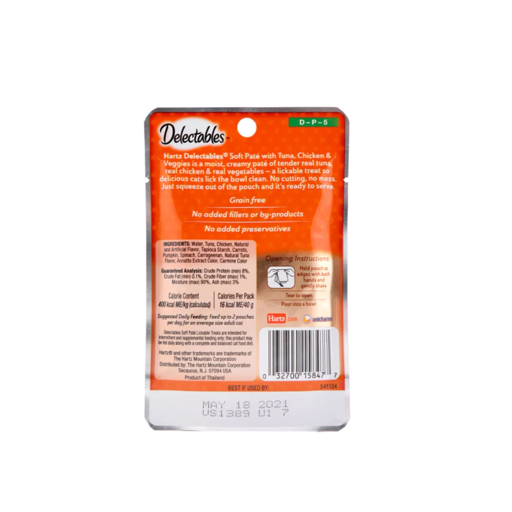Satisfy your kitty’s taste buds with Hartz Delectables Soft Pate Tuna, Chicken & Veggies Cat Treats. These treats feature tender chicken and succulent fish with vegetables in a smooth pate to entice your furry friend. They contain nutritious and flavorful ingredients delectably blended and are specially formulated with vitamin E and B vitamins to support senior cat health. This pate is also grain-free with no added fillers or by-products or preservatives for a treat you can trust. Ideal as a snack or topper for regular food, tear open a pouch of Hartz Delectables Soft Pate Tuna, Chicken & Veggies Cat Treats and watch your paw-tner enjoy.