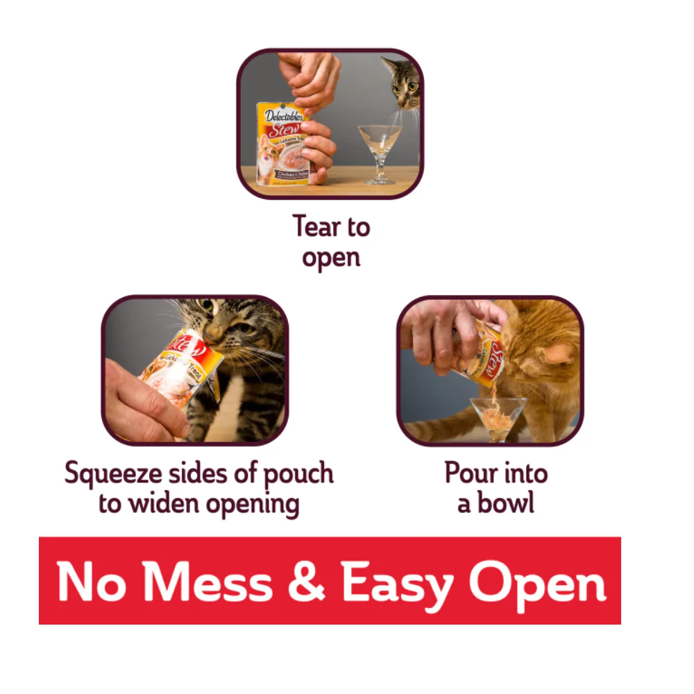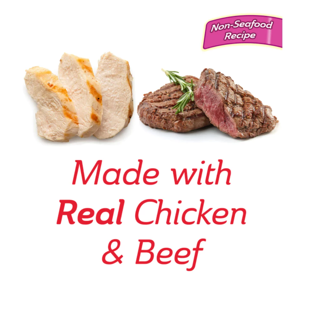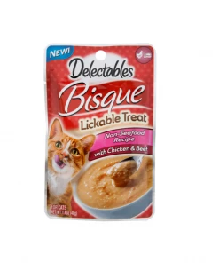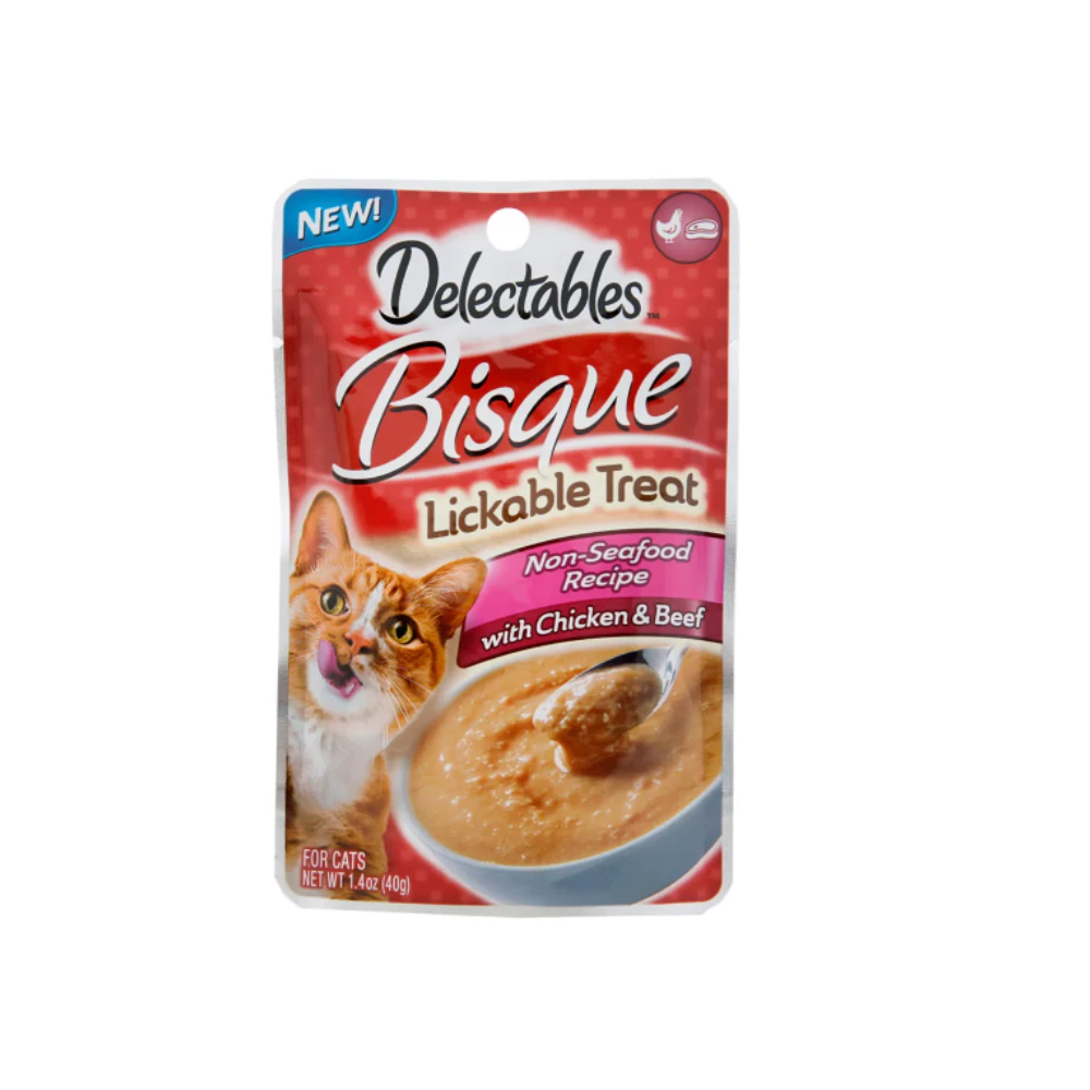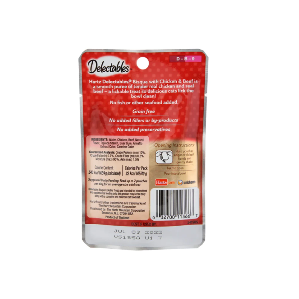 Help your mini mate make it through the day with Hartz Delectables Bisque Non-Seafood Chicken & Beef Lickable Wet Cat Treats. These unique, lickable liquid treats for cats are blended to create a delicious and delightful snack for your sidekick. They are made with a creamy, seafood-free recipe that combines tender, real chicken with rich, meaty beef and a savory broth. These liquid cat treats are paw-fect for senior kitties who have trouble chewing and can be used as a food topper for other cats too! They are packaged for your quick-serving convenience in handy, easy-to-open, single-serve pouches just for your precious pal.