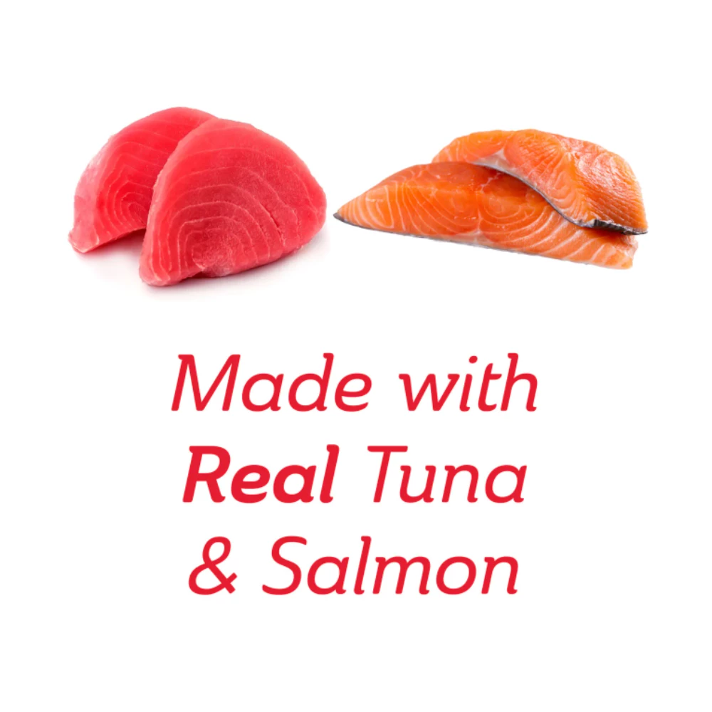 Water, Tuna, Salmon, Natural and Artificial Flavor, Tapioca Starch, Guar Gum, Natural Tuna Flavor.
