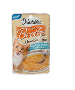 Your kitty companion is sure to savor every drop of Hartz Delectables Savory Broths Tuna, Shrimp & Whitefish Lickable Treats! This rich broth features a feline-approved combination of real whitefish, shrimp, and tuna. The recipe is grain-free and made without fillers, artificial preservatives, colors, and by-products. On top of that, the lickable treat also delivers a delicious hydration boost. Whether you serve it as a scrumptious snack or tasty topper, no cat can resist a Delectables Savory Broth!