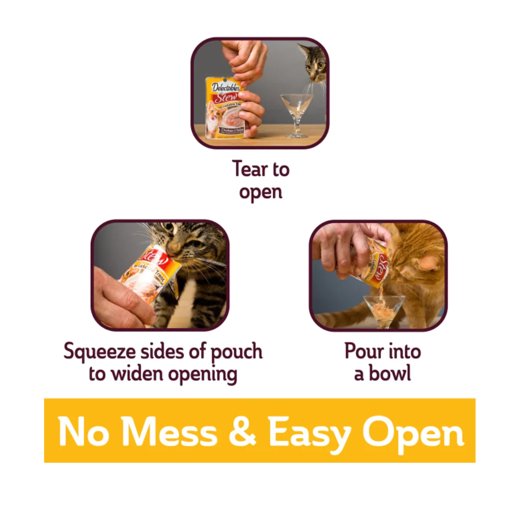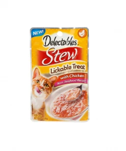 Your feline friend won’t be able to resist the delectable taste of Hartz Delectables Non-Seafood Chicken Recipe Stew Lickable Wet Cat Treats. These unique treats combine tender, real chicken and broth to make a hearty stew. The nutritious, seafood-free recipe is blended into a liquid consistency for easy-to-lap eating—a great option for senior kitties! The handy single-serve pouch makes it a cinch to offer your precious pet a delish treat or an enticing meal topper.