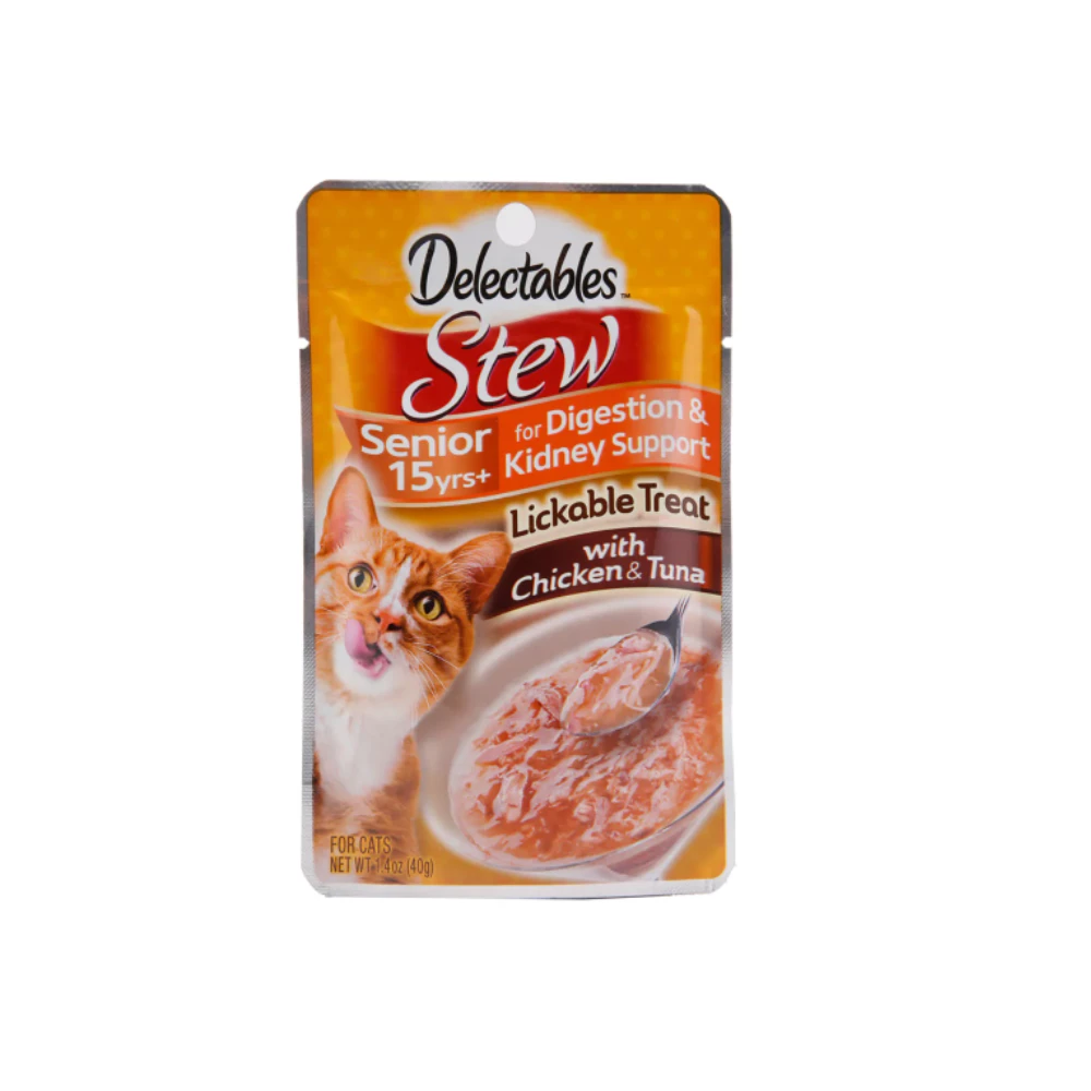 Hartz Delectables Stew Chicken & Tuna Lickable Cat Treat is a deliciously unique, single serve, wet treat cats purr for. Your cat will enjoy this yummy combination of tender, real chicken and tuna chunks in a rich sauce. Formulated with vitamin E, B vitamins, potassium and prebiotics for digestion and kidney support, this treat is made to support the health of your aging cat, 15 years and over. Make every treat time something truly special with this lickable, tasty treat your cat will crave.