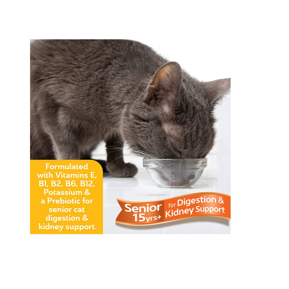 - Formulated with Vitamins E, B1, B2, B6, B12, Potassium and an added prebiotic to support healthy digestion and kidney function in mature cats 15 years of age and older