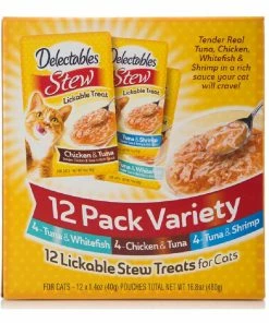 Treat your kitty to the best of both land and sea with Hartz Delectables Stew Variety Pack Lickable Cat Treats. Each case comes with 12 Stew packets in three scrumptious flavors—Tuna & Whitefish, Chicken & Tuna, and Tuna & Shrimp. Hartz Stew recipes are crafted with either real fish or chicken for the high-quality protein your BFF deserves and offer a hearty consistency that’s sure to please the finickiest felines! Simply open the pouch, pour it into a bowl, and let him enjoy the rich reward as a snack between meals or as a tasty kibble topper. Any way you serve it, these purr-worthy treats will leave your cat licking his chops!