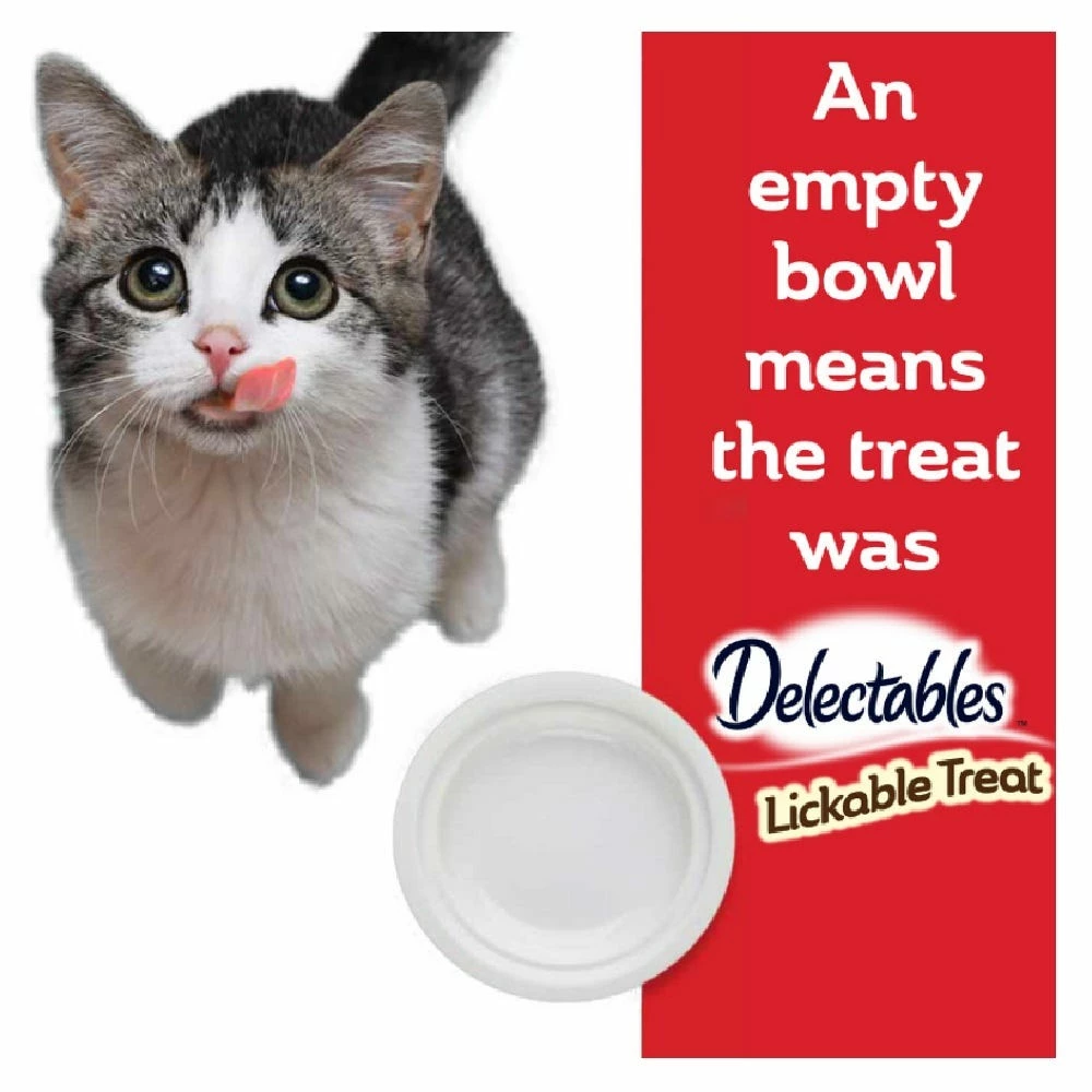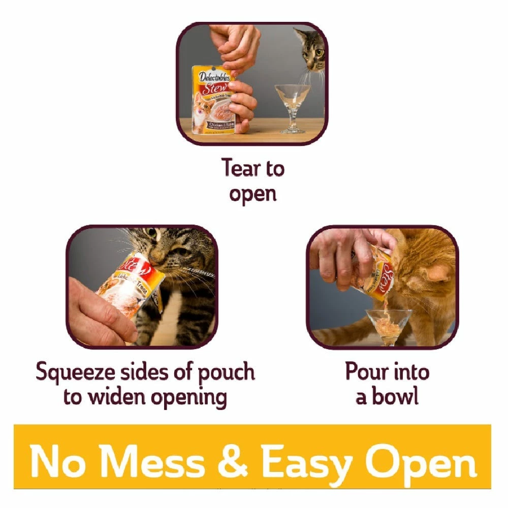 Feed up to 2 pouches per day for an averaged size adult cat. Delectables Stew Lickable Treats are intended for intermittent and supplemental feeding only. This product may be fed daily along with a complete and balanced cat food diet.