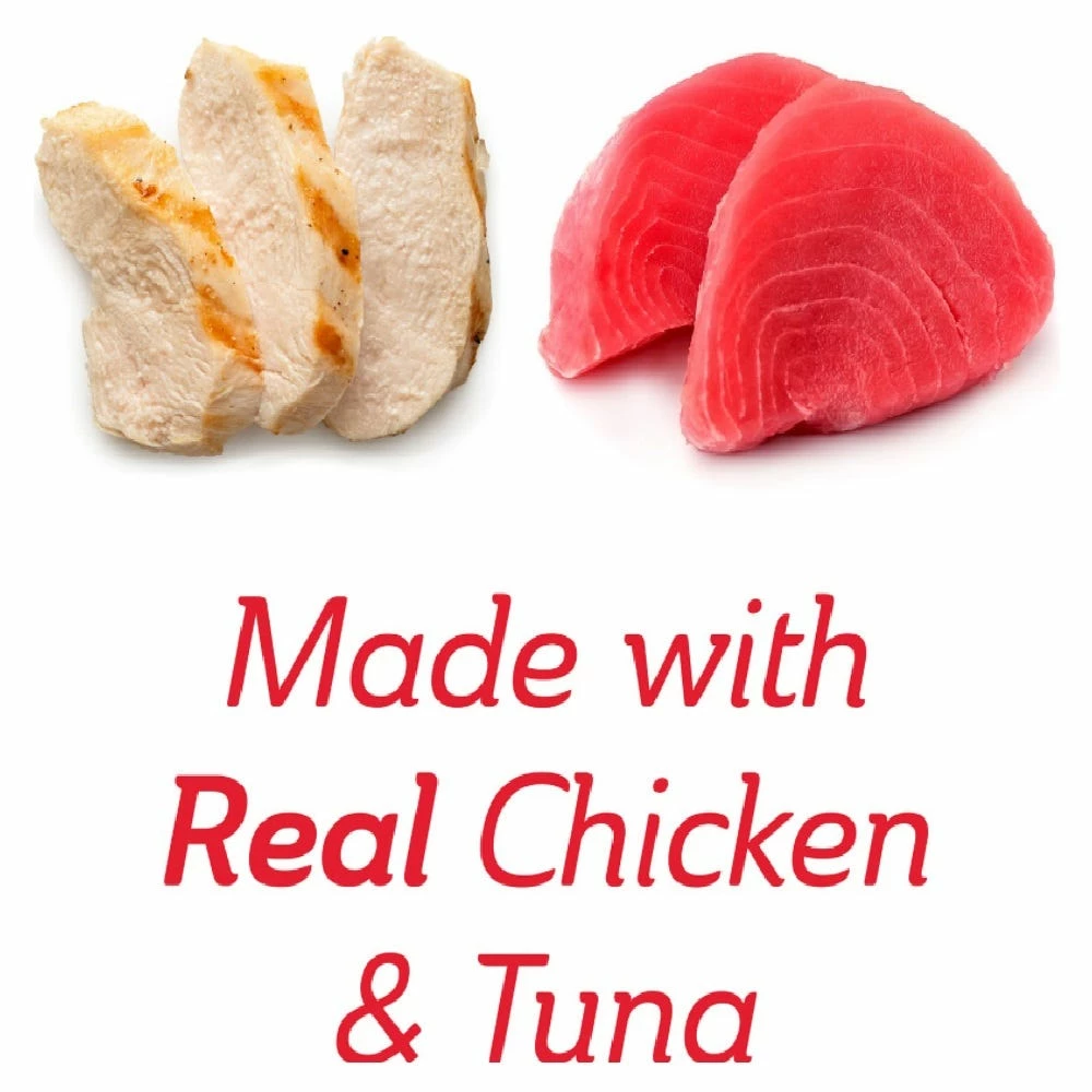 Water, Chicken, Tuna, Natural and Artificial Flavor, Modified Tapioca Starch, Guar Gum, Tuna Extract, Carrageenan, Xanthan Gum, Locust Bean Gum.