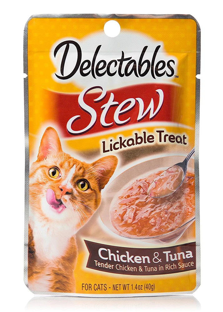 Hartz Delectables Stew Chicken & Tuna Lickable Cat Treat is a deliciously unique, single serve, wet treat cats purr for. Your cat will enjoy this yummy combination of tender, real chicken and tuna chunks in a rich sauce. Make every treat time something truly special with this lickable, tasty treat your cat will crave.