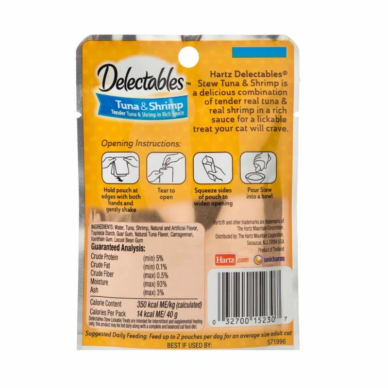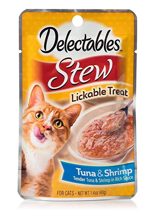Hartz Delectables Stew Tuna & Shrimp Lickable Cat Treat is a deliciously unique, single serve, wet treat cats purr for. Your cat will enjoy this yummy combination of tender, real tuna and shrimp chunks in a rich sauce. Make every treat time something truly special with this lickable, tasty treat your cat will crave.