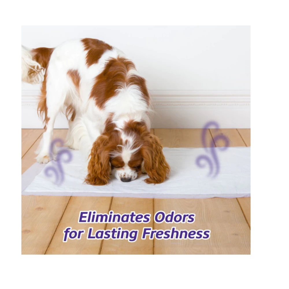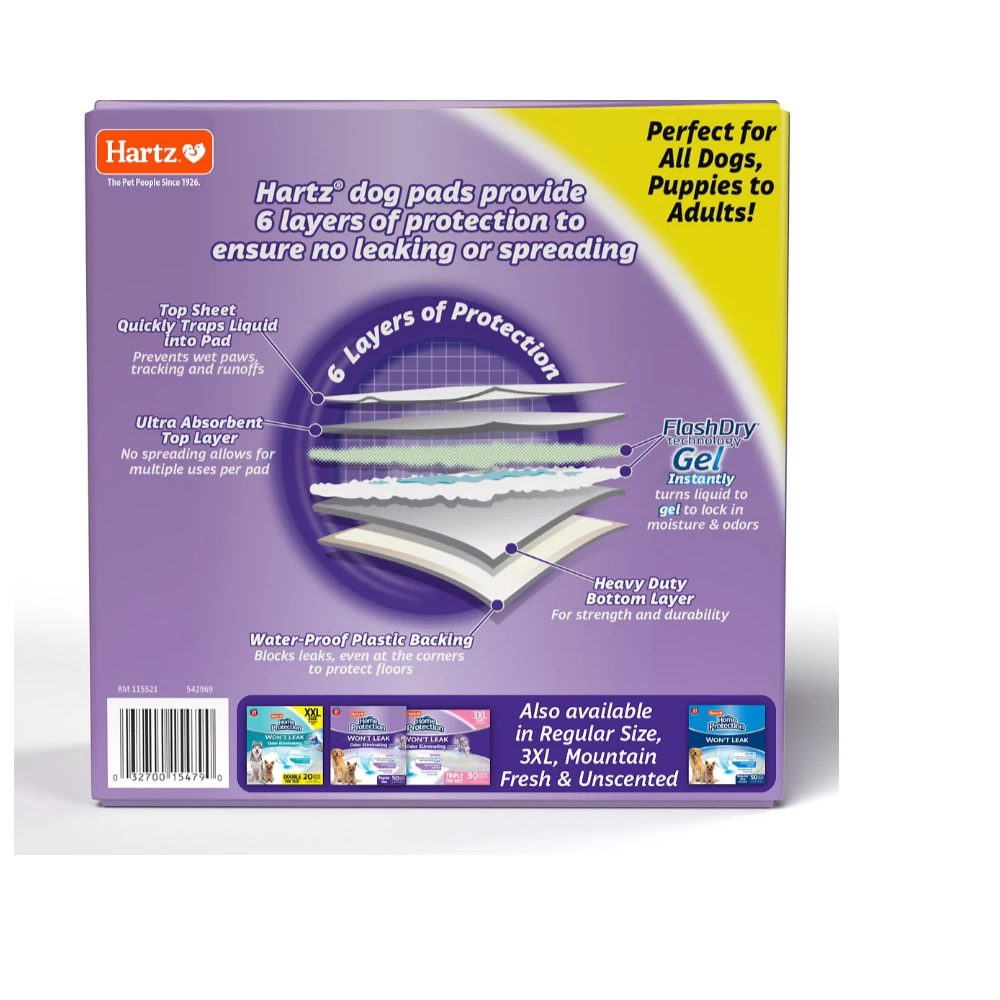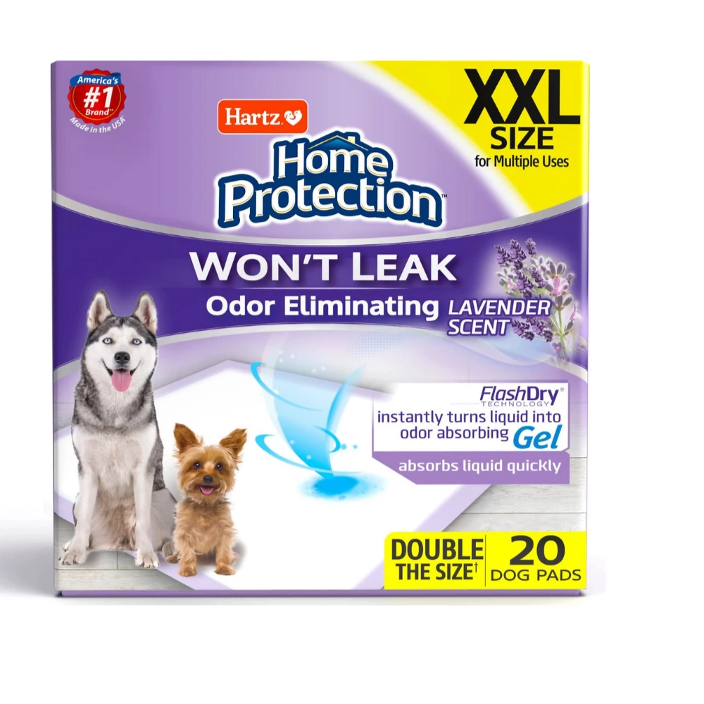 Help keep your home clean and free of urine smells with the Hartz Home Protection Fresh Scent Odor Eliminating Dog Pads. Made with Flash-Dry technology, these pads instantly turn urine into a gel to prevent it from leaking or spreading on your floor or carpet and getting on your furniture. The leak protection even extends to the corners, so all doggy messes are safely contained in the pad. Plus, it has a fast-acting fresh lavender scent for lasting freshness.