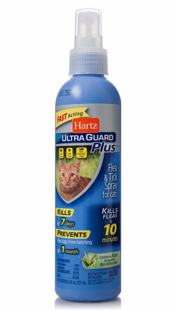 - Hartz UltraGuard Plus Aloe Flea & Tick Cat Spray kills and repels pesky fleas and ticks for up to 7 days while preventing re-infestation by stopping flea eggs from hatching for 30 days.