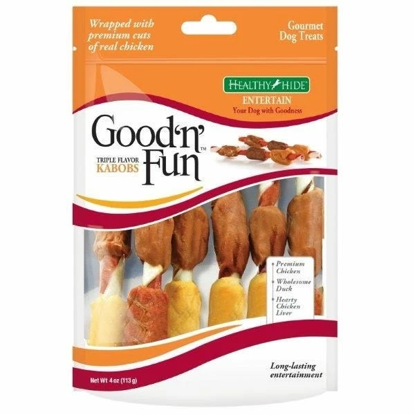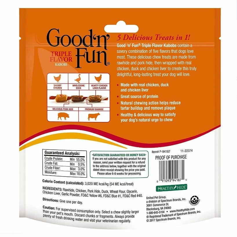 Good ‘n’ Fun brand offers a tasty smorgasbord of flavors that dogs love. These delicious chews are made from the finest ingredients, including real beef hide and real chicken, to create truly delightful, long-lasting treats your dog will love. Tails will be wagging for flavor-packed Good ‘n’ Fun Triple Flavor Kabobs, made with a savory combination of five flavors that dogs love most. These delicious chew treats are made from the finest rawhide and pork hide, then wrapped with real, savory chicken, wholesome duck and hearty chicken liver flavor to create a truly delightful, long-lasting rawhide treat your dog will love. A great source of protein, Good ‘n’ Fun Triple Flavor Kabobs are a healthy and delicious way to satisfy your dog’s natural urge to chew. The natural action of chewing also helps reduce tartar buildup and remove plaque. Give your dog one Good ‘n’ Fun Triple Flavor Kabob rawhide chew per day. For supervised consumption only. Select a chew slightly larger than your pet’s mouth. Discard chunks or fragments. Always provide plenty of fresh drinking water and visit your veterinarian regularly.One a day. Select a chew slightly larger than your dog’s mouth. Supervise consumption. Feed as treat or reward once a day. Discard any chunks or fragments. Always provide plenty of clean fresh drinking water and visit your veterinarian regularly. Wash your hands thoroughly after handling treats.