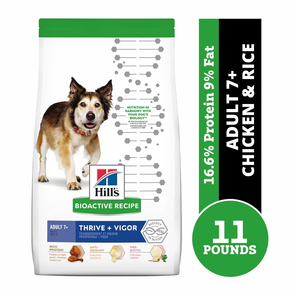 Hill’s Bioactive Recipe Thrive + Vigor contains a synergistic blend that includes Rich Protein, Gut-Friendly Beet Pulp and Vitamin E. Chicken #1 Ingredient. No Corn, Wheat, or Soy. Not artificially preserved, colored or flavored. Key ingredients to: Help mature pets maintain their vigor as their biology changes with age. Help keep them healthy and playful for life.*Nutrition based on Hill’s ground-breaking studies on ingredients shown to bolster older dogs immunity to keep them healthy for a long life*Synergistic blend that includes Rich Protein Gut-Friendly Beet Pulp & Vitamin E*Hill’s Bioactive Recipe Adult 7+ Thrive + Vigor dog food is formulated to meet the nutritional levels established by the AAFCO Dog Food Nutrient Profiles for maintenance of adult dogs.