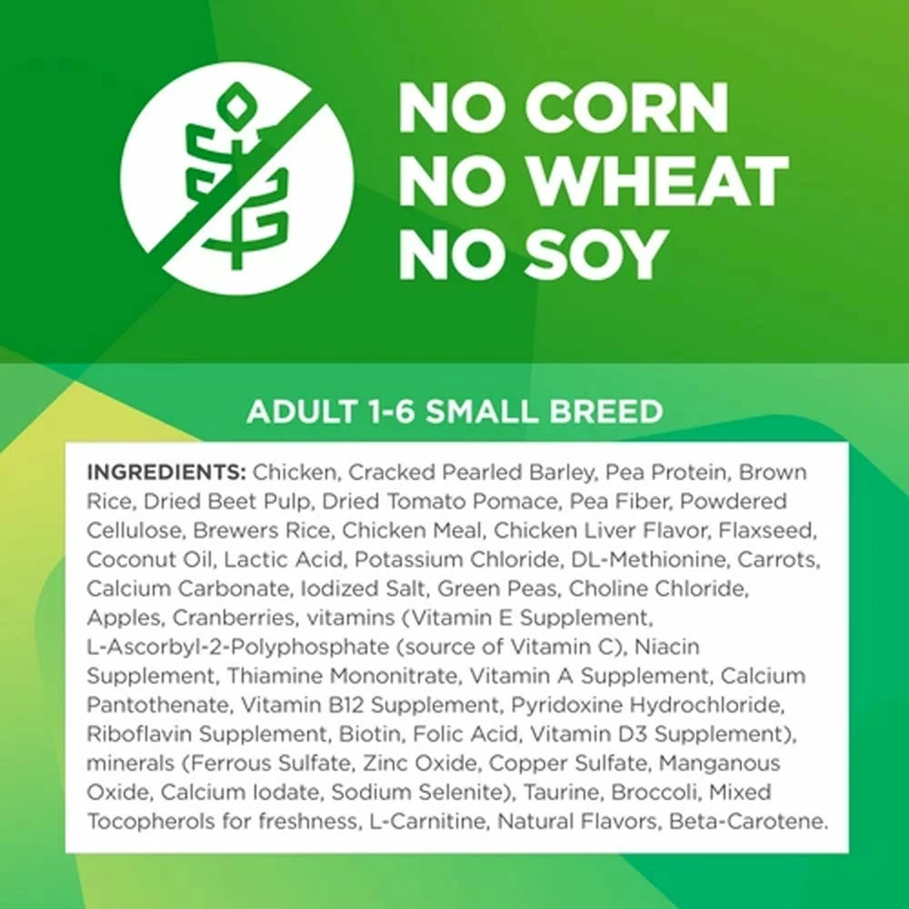 INGREDIENTS: Chicken, Cracked Pearled Barley, Pea Protein, Brown Rice, Dried Beet Pulp, Dried Tomato Pomace, Pea Fiber, Powdered Cellulose, Brewers Rice, Chicken Meal, Chicken Liver Flavor, Flaxseed, Coconut Oil, Lactic Acid, Potassium Chloride, DL-Methionine, Carrots, Calcium Carbonate, Iodized Salt, Green Peas, Choline Chloride, Apples, Cranberries, vitamins (Vitamin E Supplement, L-Ascorbyl-2-Polyphosphate (source of Vitamin C), Niacin Supplement, Thiamine Mononitrate, Vitamin A Supplement, Calcium Pantothenate, Vitamin B12 Supplement, Pyridoxine Hydrochloride, Riboflavin Supplement, Biotin, Folic Acid, Vitamin D3 Supplement), minerals (Ferrous Sulfate, Zinc Oxide, Copper Sulfate, Manganous Oxide, Calcium Iodate, Sodium Selenite), Taurine, Broccoli, Mixed Tocopherols for freshness, L-Carnitine, Natural Flavors, Beta-Carotene.