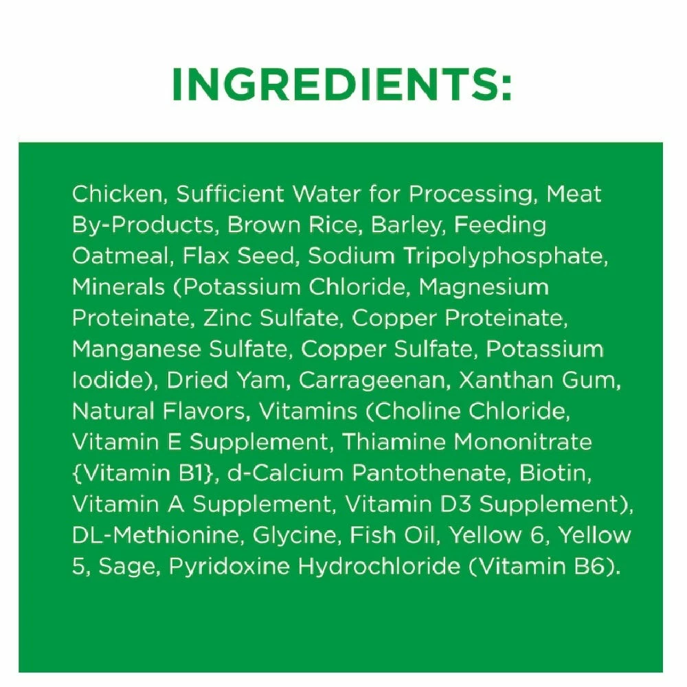 Chicken, Sufficient Water for Processing, Meat By-Products, Brown Rice, Barley, Feeding Oatmeal, Flax Seed, Sodium Tripolyphosphate, Minerals (Potassium Chloride, Magnesium Proteinate, Zinc Sulfate, Copper Proteinate, Manganese Sulfate, Copper Sulfate, Potassium Iodide), Dried Yam, Carrageenan, Xanthan Gum, Natural Flavors, Vitamins (Choline Chloride, Vitamin E Supplement, Thiamine Mononitrate {Vitamin B1}, d-Calcium Pantothenate, Biotin, Vitamin A Supplement, Vitamin D3 Supplement), DL-Methionine, Glycine, Fish Oil, Yellow 6, Yellow 5, Sage, Pyridoxine Hydrochloride (Vitamin B6).