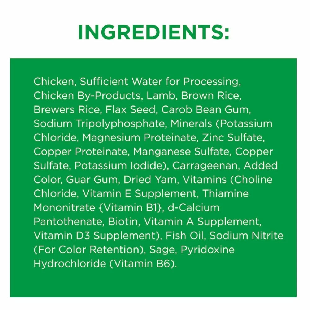 Chicken, Sufficient Water for Processing, Chicken By-Products, Lamb, Brown Rice, Brewers Rice, Flax Seed, Carob Bean Gum, Sodium Tripolyphosphate, Minerals (Potassium Chloride, Magnesium Proteinate, Zinc Sulfate, Copper Proteinate, Manganese Sulfate, Copper Sulfate, Potassium Iodide), Carrageenan, Added Color, Guar Gum, Dried Yam, Vitamins (Choline Chloride, Vitamin E Supplement, Thiamine Mononitrate {Vitamin B1}, d-Calcium Pantothenate, Biotin, Vitamin A Supplement, Vitamin D3 Supplement), Fish Oil, Sodium Nitrite (For Color Retention), Sage, Pyridoxine Hydrochloride (Vitamin B6).