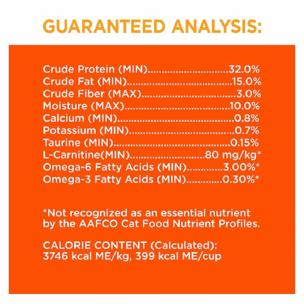 Chicken, Chicken By-Product Meal, Ground Whole Grain Corn, Corn Grits, Corn Gluten Meal, Dried Plain Beet Pulp, Chicken Fat (preserved with Mixed Tocopherols), Natural Flavor, Dried Egg Product, Sodium Bisulfate, Potassium Chloride, Brewers Dried Yeast, Fish Oil (preserved with Mixed Tocopherols), Calcium Carbonate, Choline Chloride, DL-Methionine, Fructooligosaccharides, Vitamins (Vitamin E Supplement, Niacin, Ascorbic Acid, Vitamin A Acetate, Calcium Pantothenate, Biotin, Thiamine Mononitrate (source of Vitamin B1), Pyridoxine Hydrochloride (Source of Vitamin B6), Vitamin B12 Supplement, Riboflavin Supplement (source of Vitamin B2), Inositol, Vitamin D3 Supplement, Folic Acid), Taurine, Minerals (Zinc Oxide, Manganese Sulfate, Copper Sulfate, Potassium Iodide), L-Carnitine, Rosemary Extract.