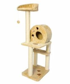 Towering at over 4ft height the Cat Tree Playground with Scratcher gives your cat a magnificent view of her territory. The four sisal posts help them condition their claws, nap in the tunnel and perch or play on the multi layered platforms. Your felines deserve the best and this royal cat tree provides just that. For added entertainment, this cat furniture comes with one plush toy that your cats can bat and chew.
