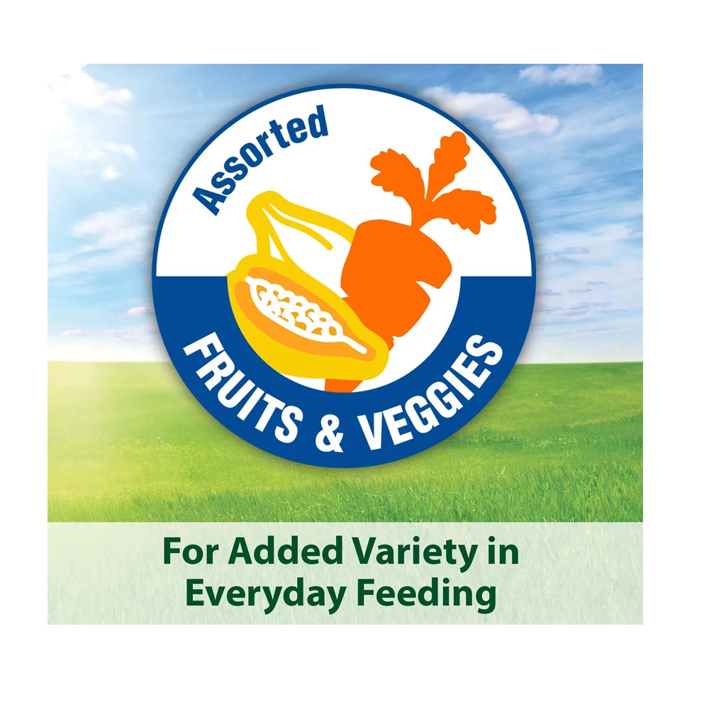 Sun-cured Timothy Grass Hay, Sun-cured Alfalfa Hay, Oats, Soybean Hulls, Ground Oats, Ground Wheat, Dehulled Soybean Meal, Wheat Middlings, Sunflower Seed, Wheat, Barley, Oat Groats, Shelled Peanuts, Ground Corn, Ground Flax Seed (Source of Omega 3), Dried Cane Molasses, Dehydrated Carrots, Raisins, Dried Bananas, Dried Papaya, Safflower Seed, Ground Rice, Dried Pineapple, Pumpkin Seed, Dehydrated Sweet Potatoes, Salt, Soybean Oil, Rice Flour, Dicalcium Phosphate, DL-Methionine, Dehydrated Apple, Fructooligosaccharide, Maltodextrins, Dextrose, Calcium Carbonate, Partially Hydrogenated Soybean Oil, Yeast Extract, Yucca Schidigera Extract, Vitamin A Supplement, Choline Chloride, Partially Hydrogenated Palm Oil, Mixed Tocopherols (Preservative), Copper Sulfate, Brewers Dried Yeast, Wheat Germ Meal, Titanium Dioxide (Color), Coconut Oil, L-Lysine, Dried Reduced Lactose Whey, Dried Nonfat Yogurt Powder, Ferrous Sulfate, Tetra Sodium Pyrophosphate, Sodium Bentonite, Sodium Bicarbonate, Sesame Seed, Vitamin E Supplement, Vitamin B12 Supplement, Riboflavin Supplement, Manganous Oxide, Zinc Oxide, Menadione Sodium Bisulfite Complex (source of Vitamin K activity), Niacin, L-Ascorbyl-2-Polyphosphate (Source of Vitamin C), Rosemary Extract, Citric Acid, Calcium Pantothenate, Cholecalciferol (Source of Vitamin D3), Pyridoxine Hydrochloride, Thiamine Mononitrate, Vanilla, Folic Acid, Calcium Iodate, Biotin, Cobalt Carbonate, Sodium Selenite, Beta-Carotene, Dried Aspergillus Oryzae Fermentation Extract, Dried Bacillus licheniformis Fermentation Product, Dried Bacillus subtilis Fermentation Product, Natural Flavor, FD&C Yellow #5, FD&C Red #40, FD&C Red #3, FD&C Blue #1, FD&C Yellow #5 Lake.