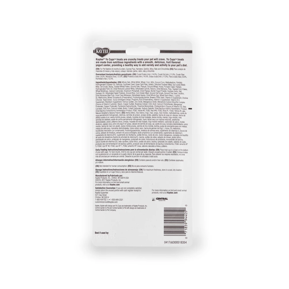KAYTEE® Fiesta® Yogurt Cup Treats are crunchy, fortified yogurt treats your pet will crave. Fiesta Yogurt Cup Treats are made from nutritious ingredients with a smooth, delicious, fruit flavored yogurt center, providing a healthy way to add variety and activity to your pet’s diet.