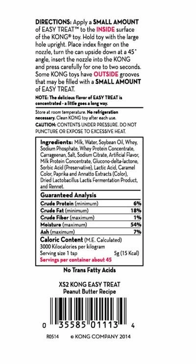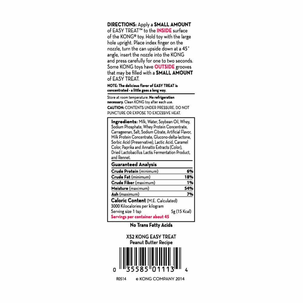 KONG Peanut Butter Easy Treat is a delicious treat that delights all types of dogs while providing an easy no-mess solution for pet parents. Made in the USA, this highly-digestible and trans-fat free treat is an enticingly delicious addition when added to a stuffed KONG. A uniquely designed nozzle easily controls the amount of KONG Easy Treat while also having the added benefit of a convenient, no mess stuffing solution. Want to make your stuffed KONG last longer? Freeze a stuffed KONG, topped with KONG Peanut Butter Easy Treat for a longer-lasting, mind occupying challenge. No Refrigeration required.
