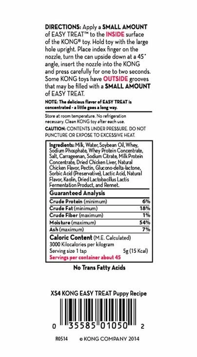 KONG Puppy Easy Treat is uniquely formulated to meet the needs of puppies. The chicken liver recipe is sure to entice and engage pups that are just getting started while providing an easy no-mess treat solution for pet parents. KONG Puppy Easy Treat is an enticingly delicious addition when added to a stuffed Puppy KONG. A uniquely designed nozzle easily controls the amount of KONG Easy Treat while having the added benefit of a convenient, no mess stuffing solution. Looking for help with crate training? Add KONG Puppy Easy Treat to your Puppy KONG stuffing for an enjoyable in-crate experience.