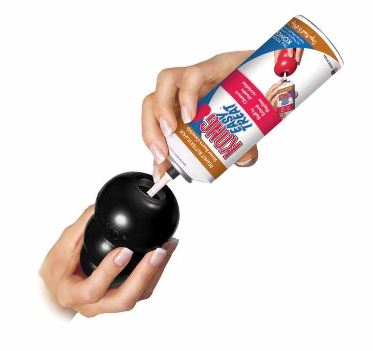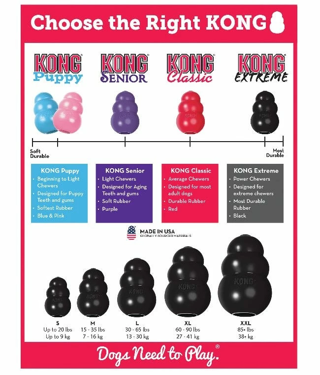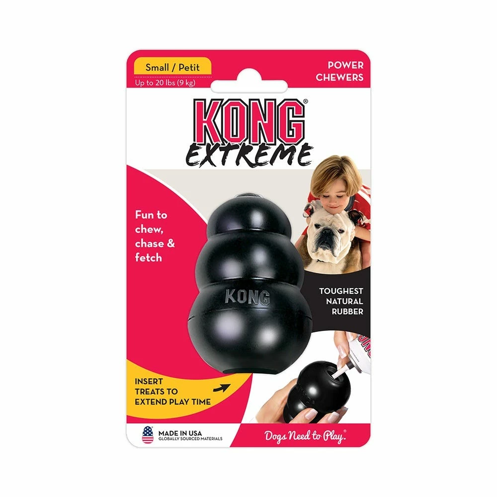 The KONG Extreme dog toy represents the most durable strength of KONG rubber. Designed for the toughest of chewers, the KONG Extreme offers enrichment and helps satisfy dogs’ instinctual needs. The KONG unique, ultra-durable, natural rubber formula is designed for determined chewers, while the erratic bounce fulfills a dog’s need to play. Want to extend play time? Be sure to stuff with tempting bits of kibble and entice with a dash of peanut butter. Add to the fun by adding KONG Snacks and top with KONG Easy Treat. Stuff and Freeze for a longer-lasting challenge.