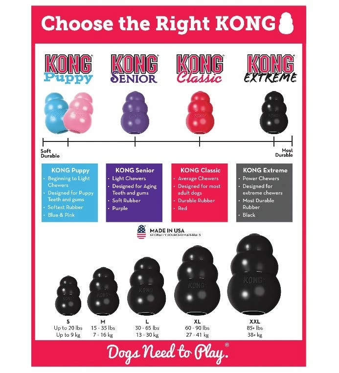 The KONG Extreme dog toy represents the most durable strength of KONG rubber. Designed for the toughest of chewers, the KONG Extreme offers enrichment and helps satisfy dogs’ instinctual needs. The KONG unique, ultra-durable, natural rubber formula is designed for determined chewers, while the erratic bounce fulfills a dog’s need to play. Want to extend play time? Be sure to stuff with tempting bits of kibble and entice with a dash of peanut butter. Add to the fun by adding KONG Snacks and top with KONG Easy Treat. Stuff and Freeze for a longer-lasting challenge.