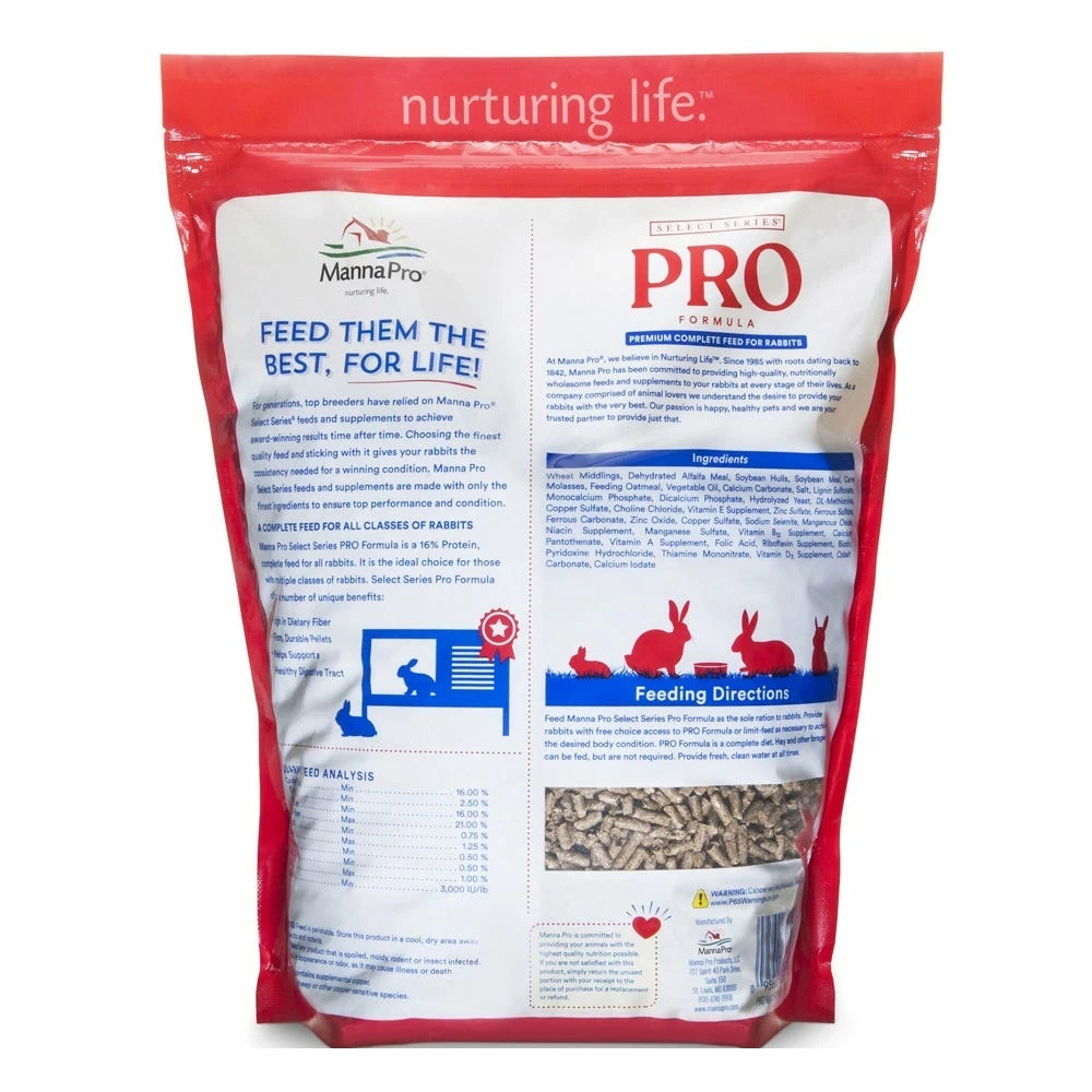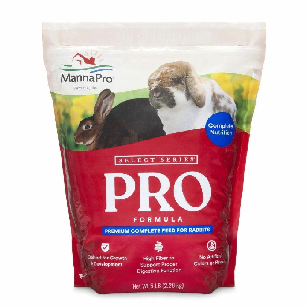 Feed Manna Pro Select Series PRO Formula to rabbits as the sole ration. Provide rabbits with free-choice access to PRO Formula or limit-feed as necessary to achieve the desired body condition. PRO Formula is a complete diet. Hay and other forages can be fed but are not required. Provide fresh, clean water at all times.